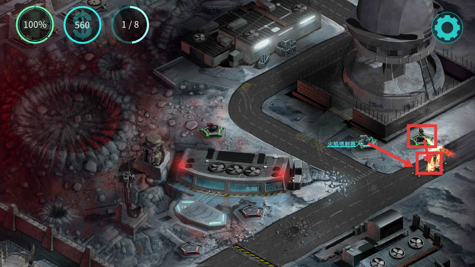 2、战斗中利用【火焰喷射器】攻击敌人,积累击杀数(如【1/8】),逐步推进战局,守护阵地。
