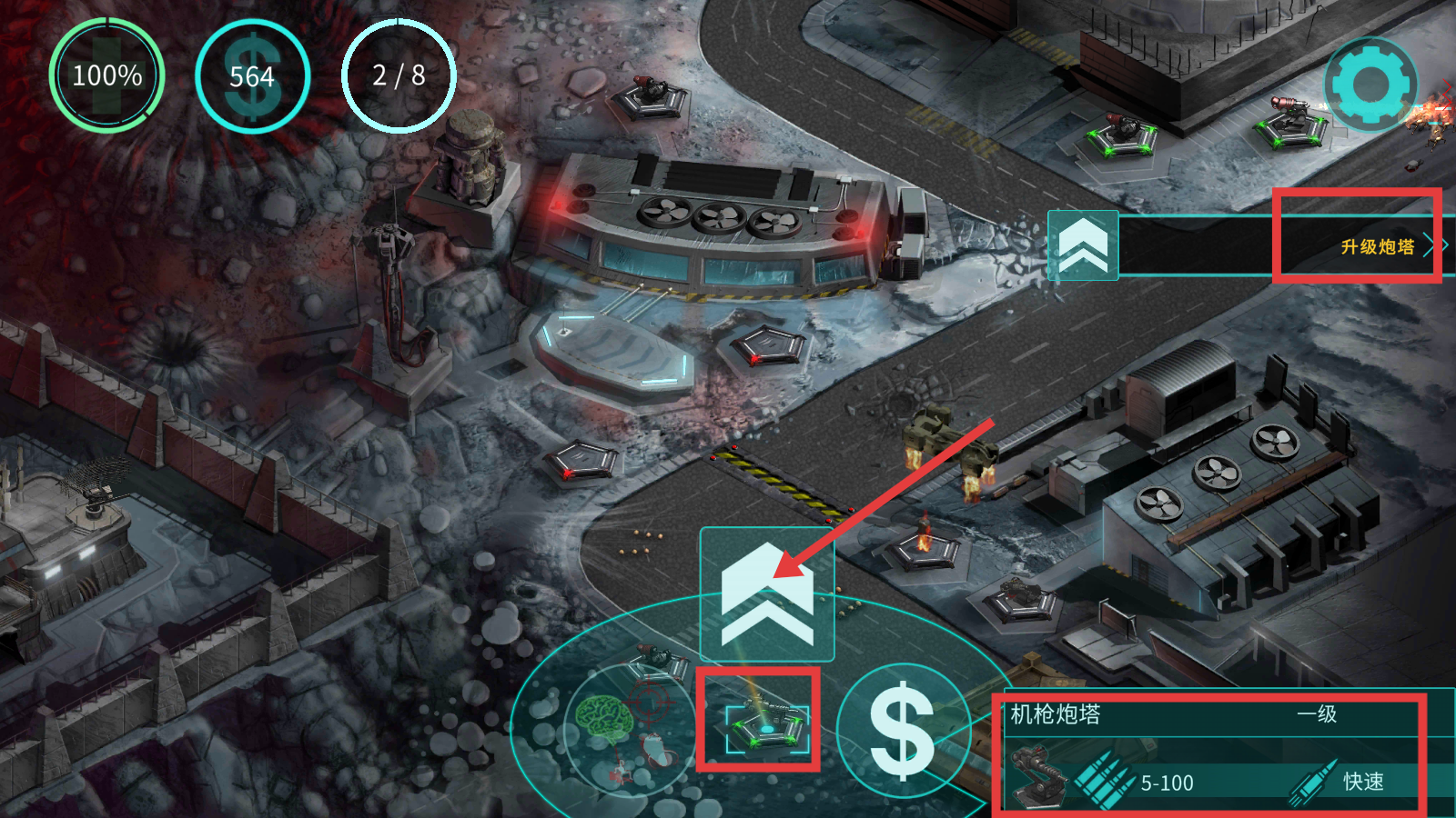 3、点击炮塔(如【机枪炮塔】)选择【升级炮塔】,提升其攻击能力,增强防御战力。