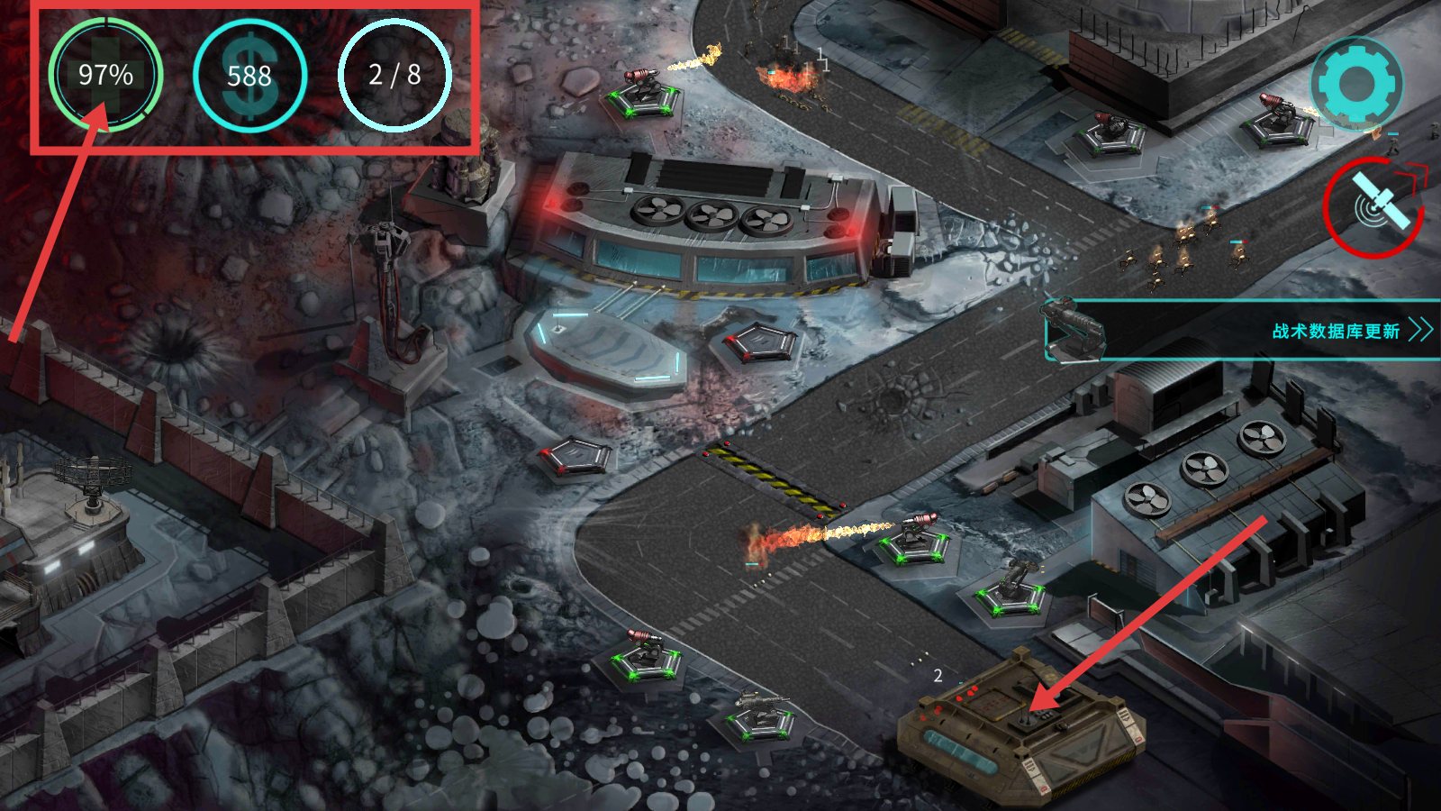 4、关注左上角资源(如【588】金币)、防御状态(如【97%】),利用坦克等单位辅助,应对敌人进攻,推进任务。