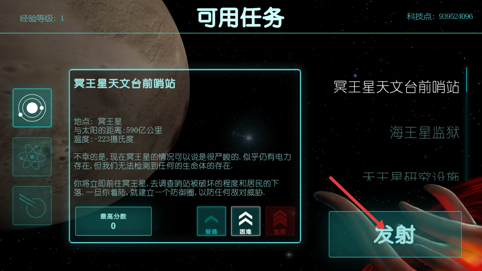 1、选择【冥王星天文台前哨站】任务,点击【发射】按钮,前往冥王星调查破坏程度并建立防御圈。