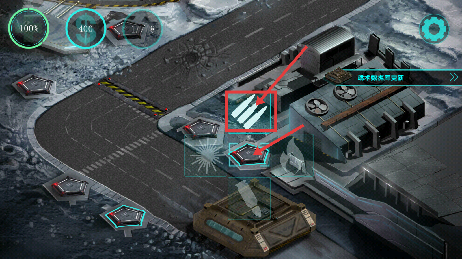 2、战斗中选择武器类建筑(如导弹图标),布置在关键位置,构建防御阵地。