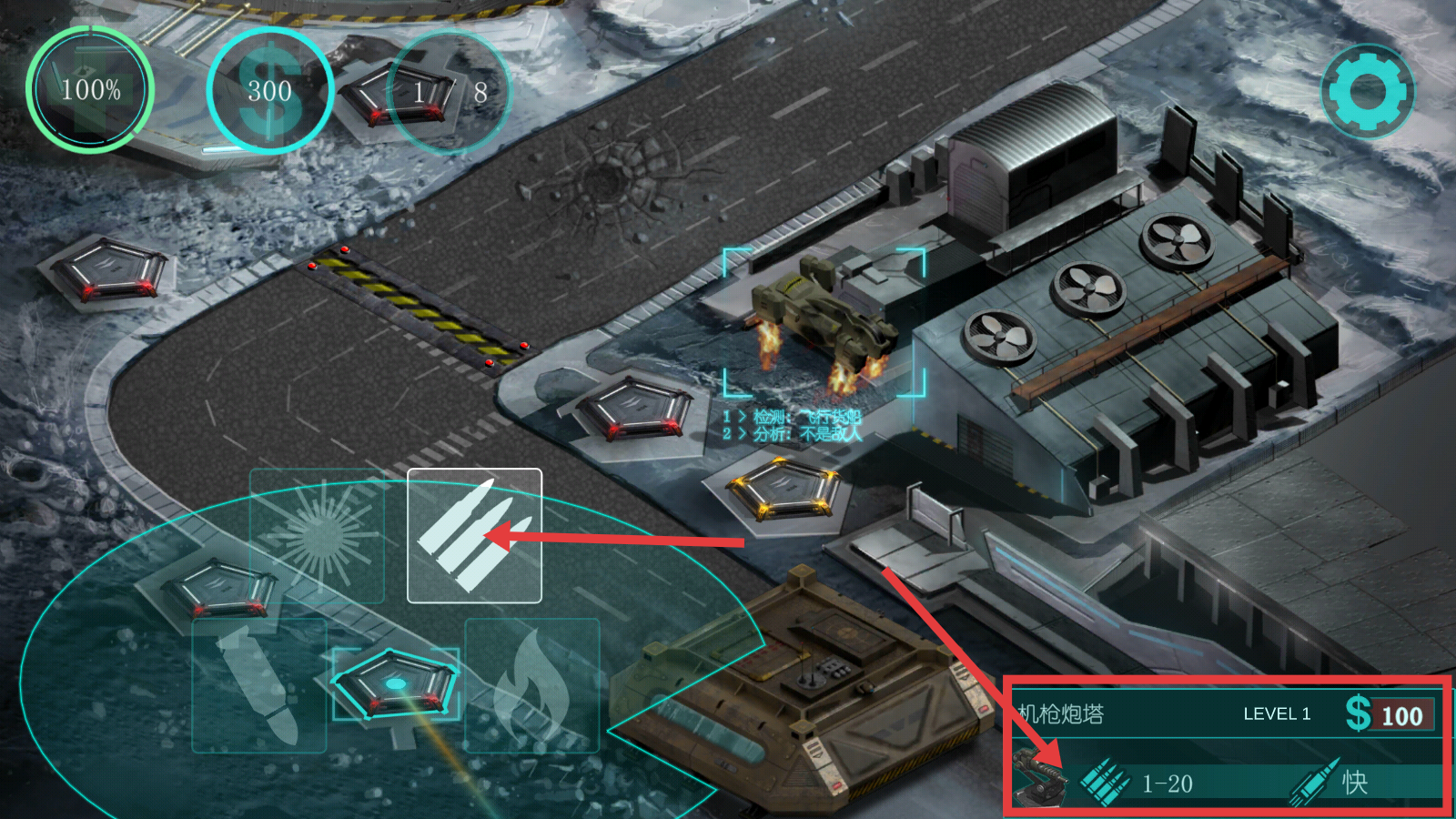 3、部署【机枪炮塔-LEVEL-1】,花费【100-金币】,利用其快速攻击属性防御敌人。