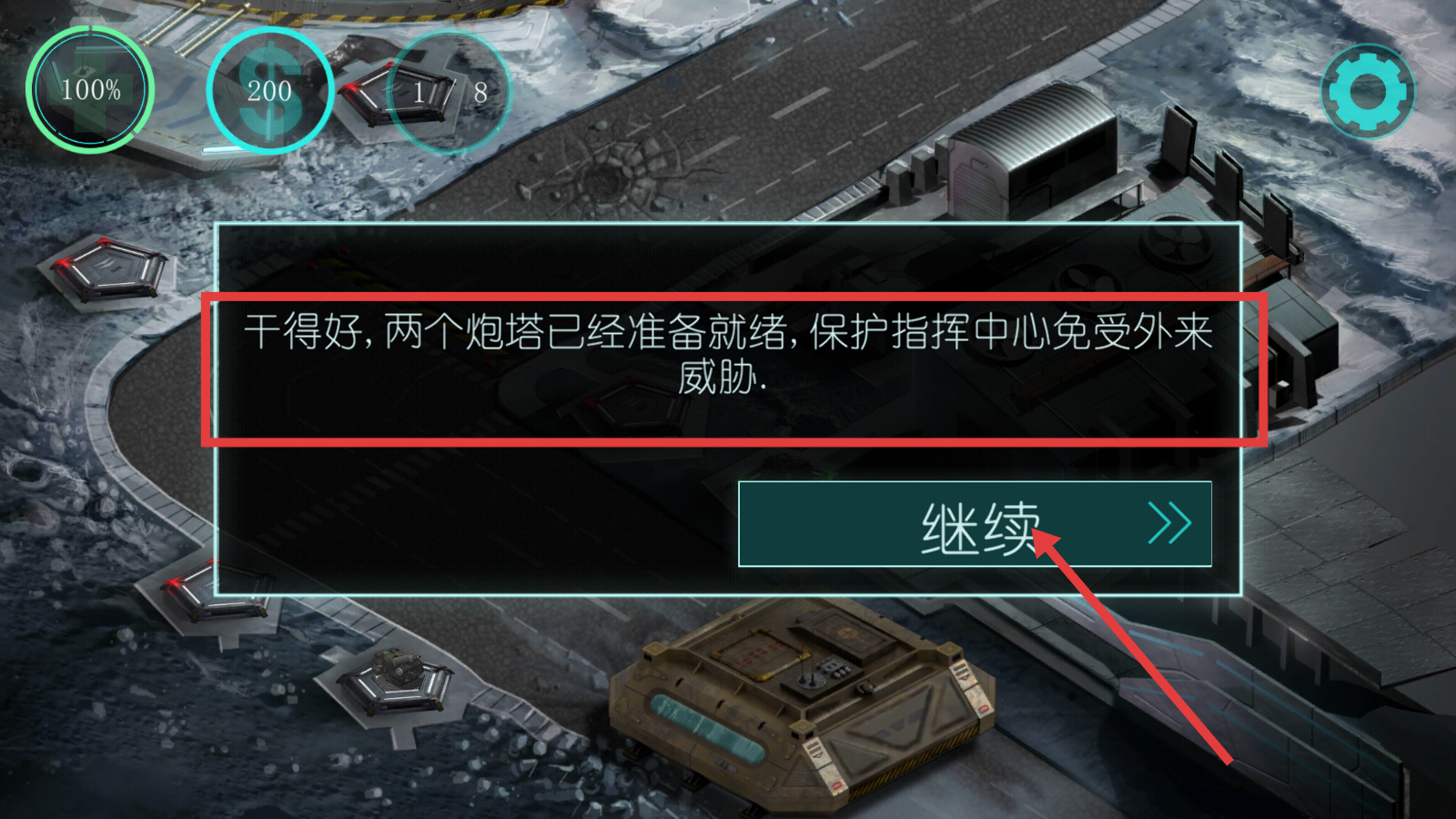 4、完成炮塔布置后,点击【继续】按钮,推进任务,保护指挥中心免受威胁。