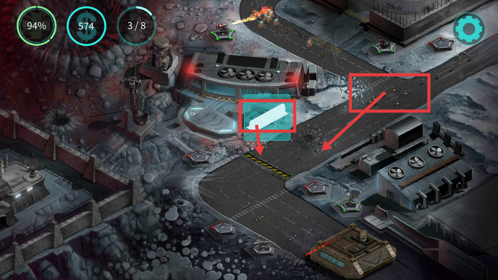 1、战斗中关注【94%-防御】【574-金币】,利用建筑抵挡敌人,推进击杀进度【3/8】,守护阵地。