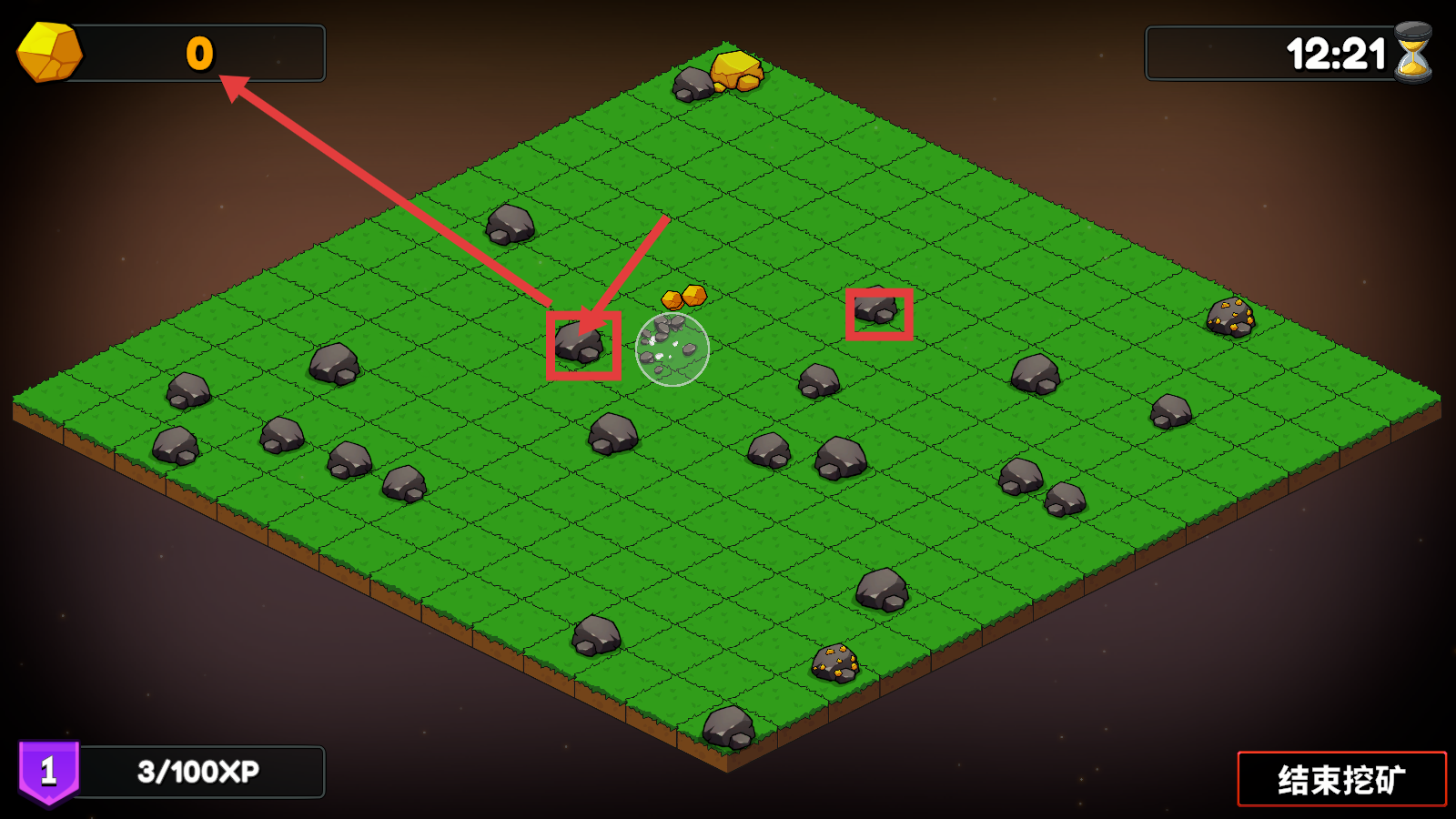 2、挖矿时点击石头,收集矿石,积累左上角矿石数量,提升挖矿进度。