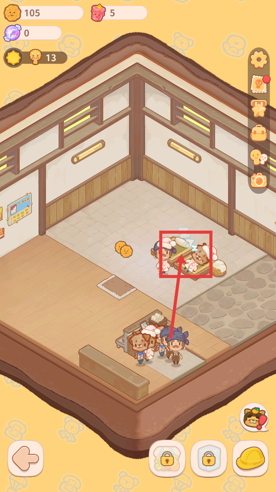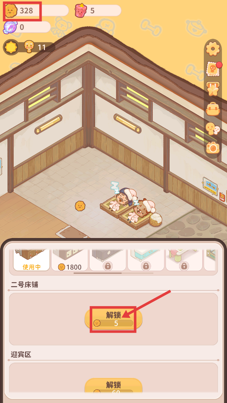 4、消耗饼干-5解锁二号床铺,增加住宿容量,助力接待更多角色。