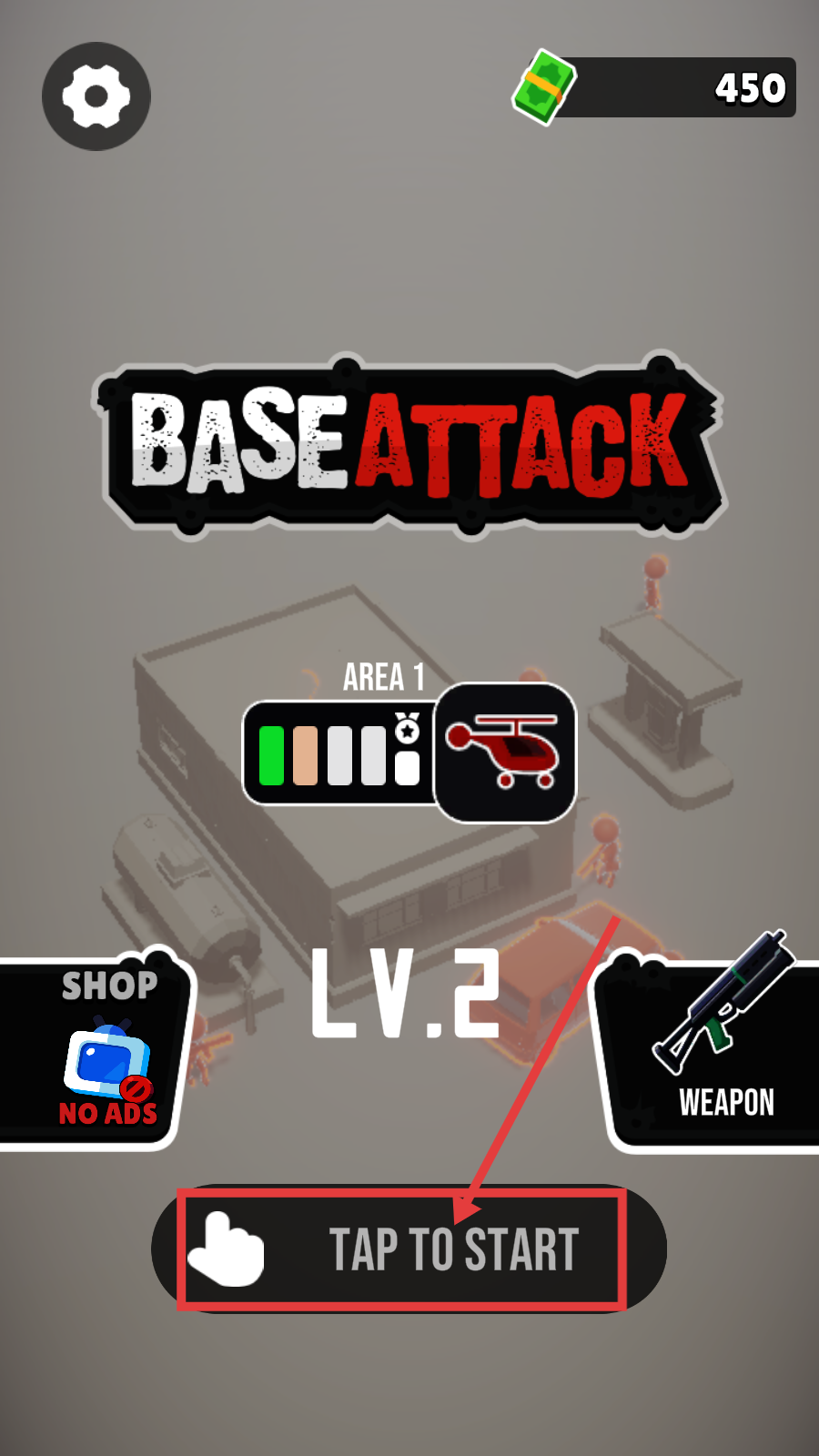 1、进入【BASE-ATTACK】的LV.2界面,点击【TAP-TO-START】开始游戏,留意【SHOP】和【WEAPON】选项,为战斗做好准备。