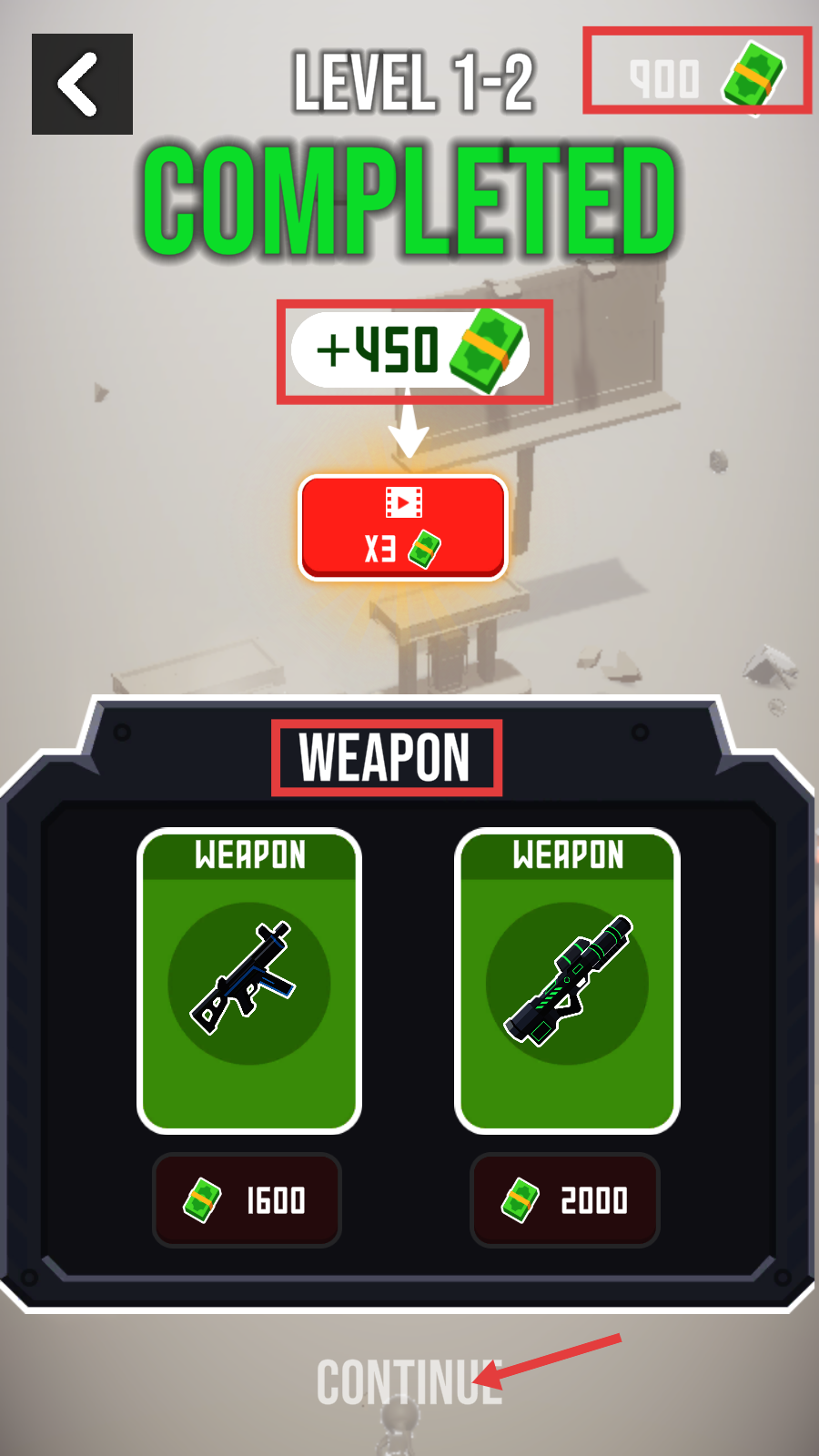 4、关卡完成后获得【+450】金钱奖励,可选择观看视频翻倍或点击【CONTINUE】继续,积累资源用于解锁新武器。