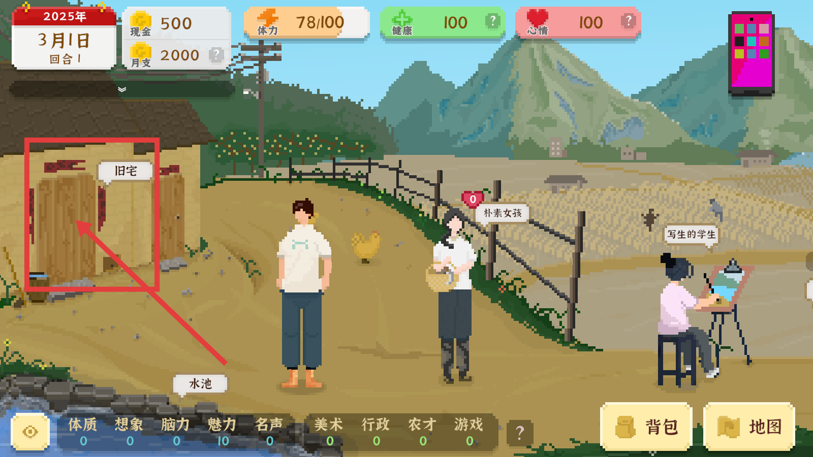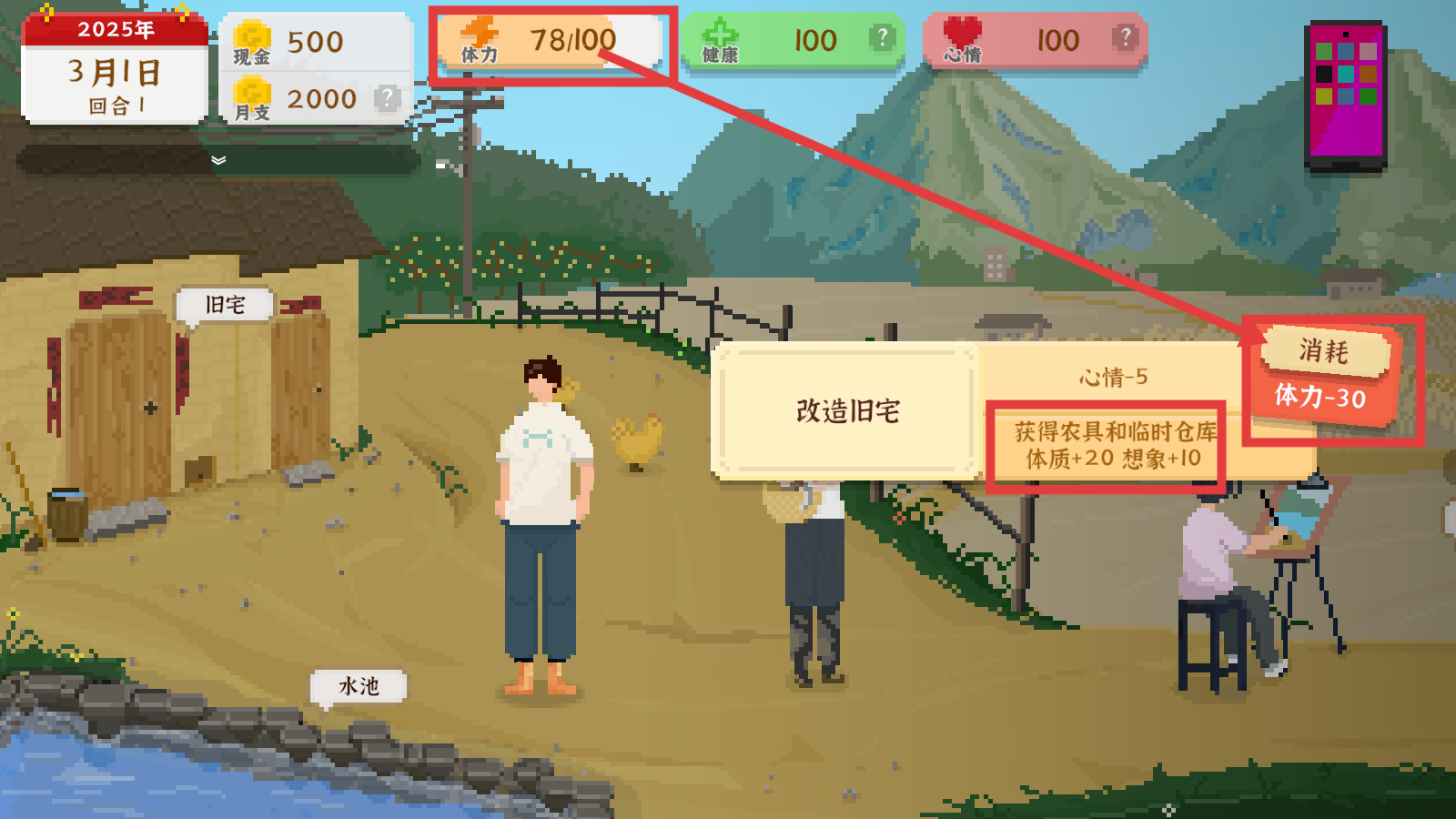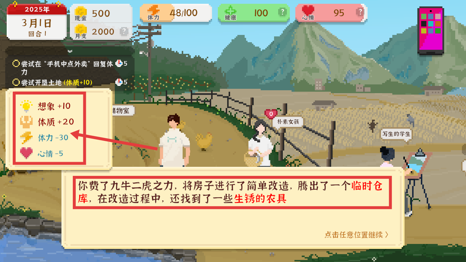 2、改造旧宅会消耗【体力-30】,但可获得农具和临时仓库,同时提升【体质+20】【想象+10】,值得优先操作。