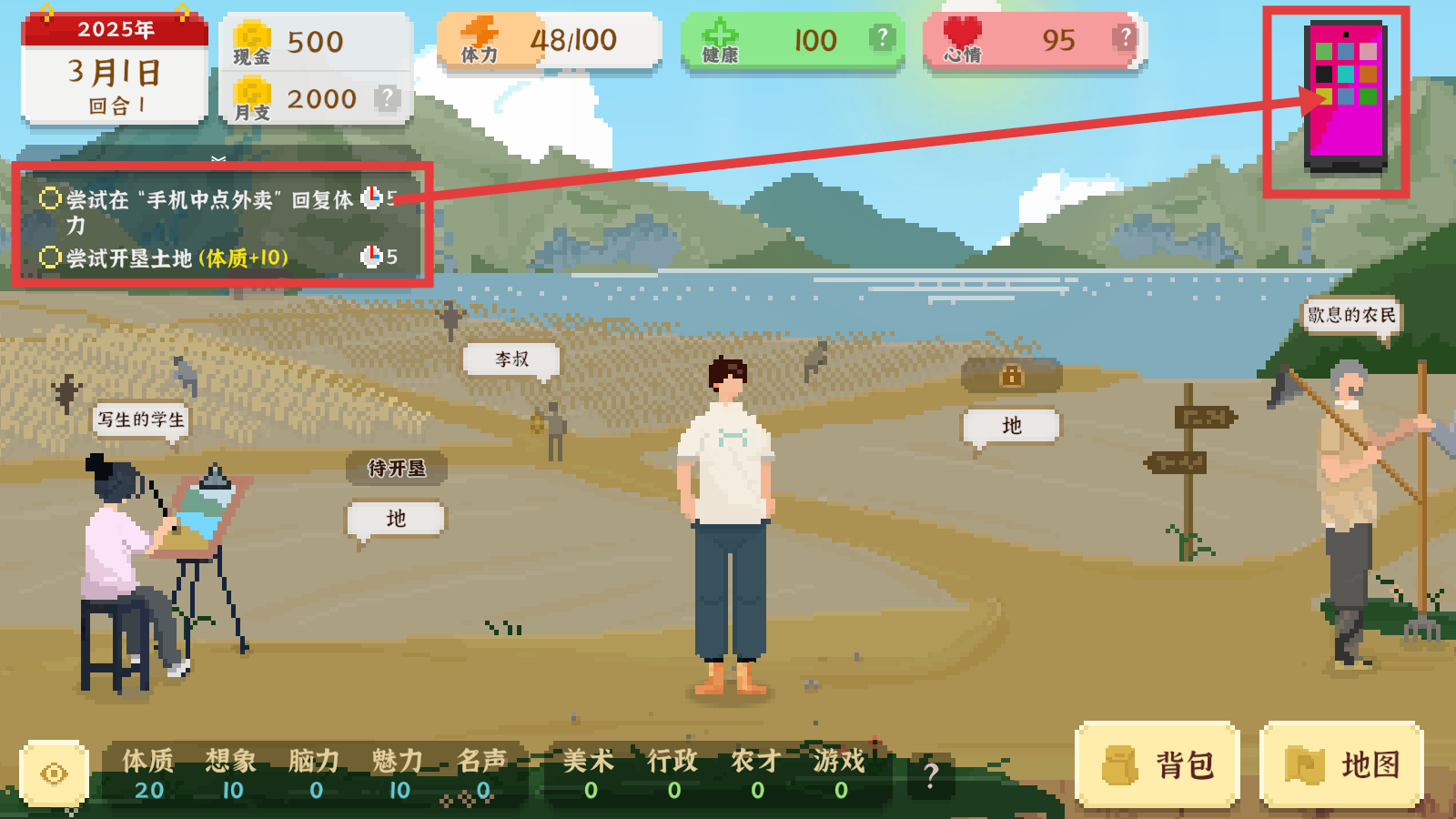 4、点击右上角手机,可接取【尝试在手机中点外卖-回复体力】和【尝试开垦土地-体质+10】任务,完成可提升对应属性。