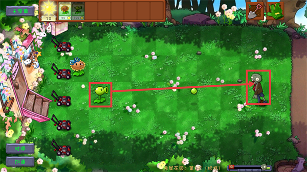 3、利用【豌豆射手】发射豌豆攻击僵尸,有效阻止僵尸前进,保障花园安全。