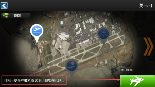 3、接乘客送目的地:在机场接上等待的家庭乘客,确认乘客登机后,驾驶飞机飞往目标国家,安全降落后完成接送任务。