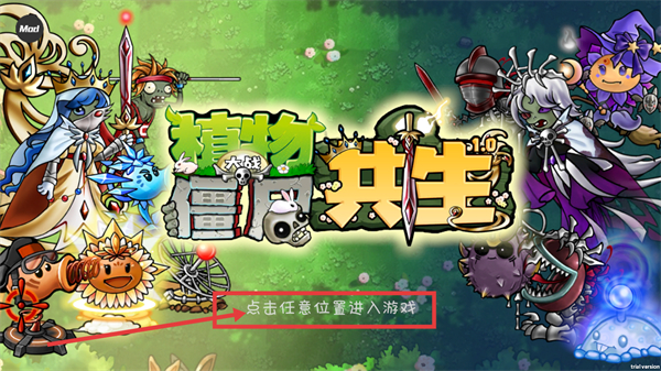 1、在【植物大战僵尸-共生1.0】界面,点击任意位置进入游戏,开启植物与僵尸的对战冒险。