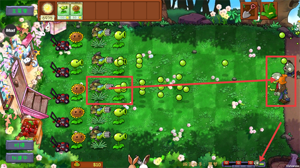 4、大规模布局高级豌豆植物和其他攻击植物,高效消灭僵尸,获取金钱奖励,积累资源用于后续植物升级与布局。