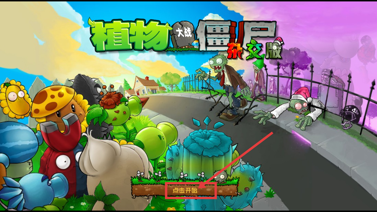 1、在【植物大战僵尸-杂交版】界面,点击【点击开始】,开启植物与僵尸的对战冒险。
