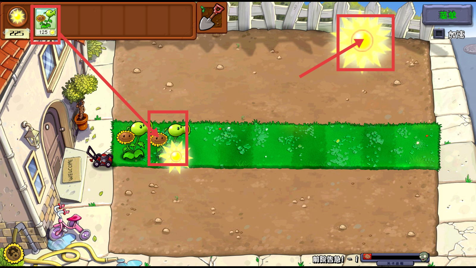 2、收集【阳光】,种植【豌豆射手】和向日葵,积累阳光资源,为后续植物布局做准备。