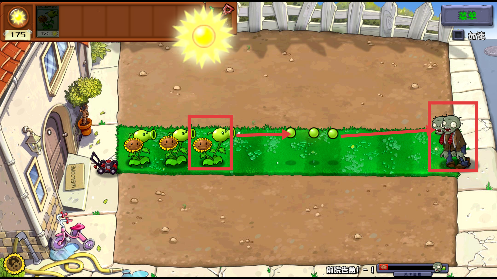 3、让【豌豆射手】发射豌豆攻击僵尸,有效阻止僵尸前进,建立初步防御防线。