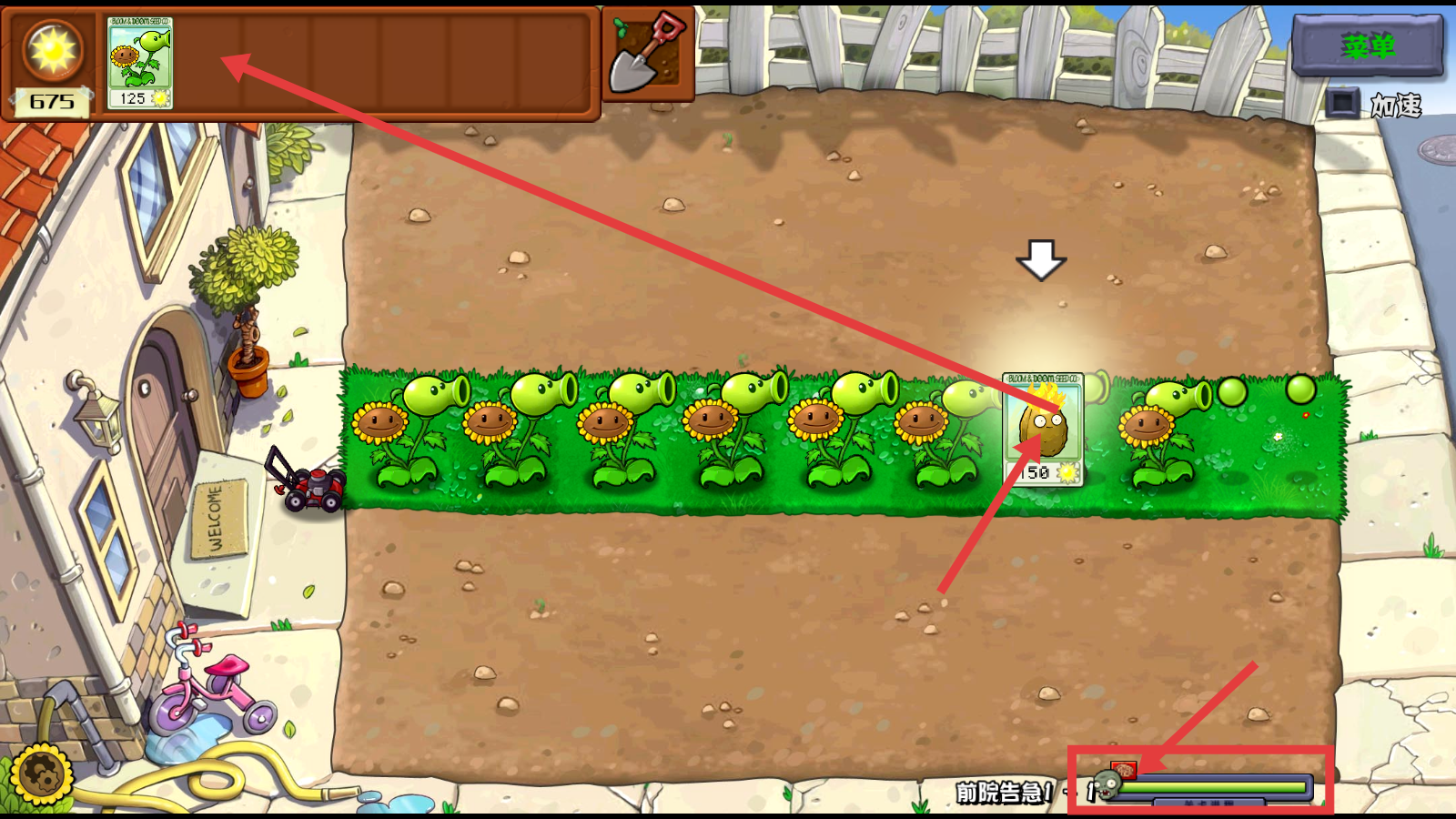 4、积累足够阳光后,种植【坚果】等防御植物,加固防线,关注关卡进度条,顺利推进游戏进程。