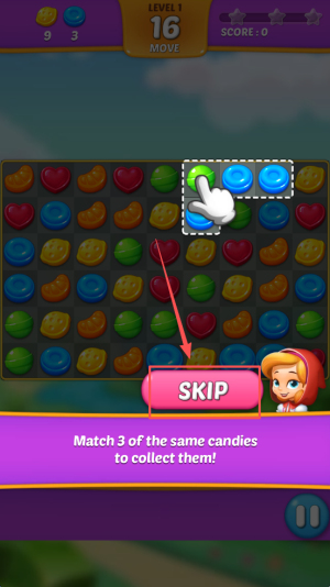 2、接着,通过匹配三个相同的糖果来收集它们,如果需要可以点击“SKIP”跳过难以匹配的步骤。