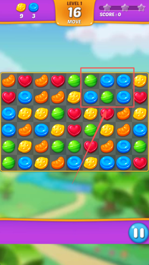 2、匹配元素消除:观察界面中棒棒糖分布,移动元素使三个及以上相同样式棒棒糖连成一线,触发消除并获得分数。