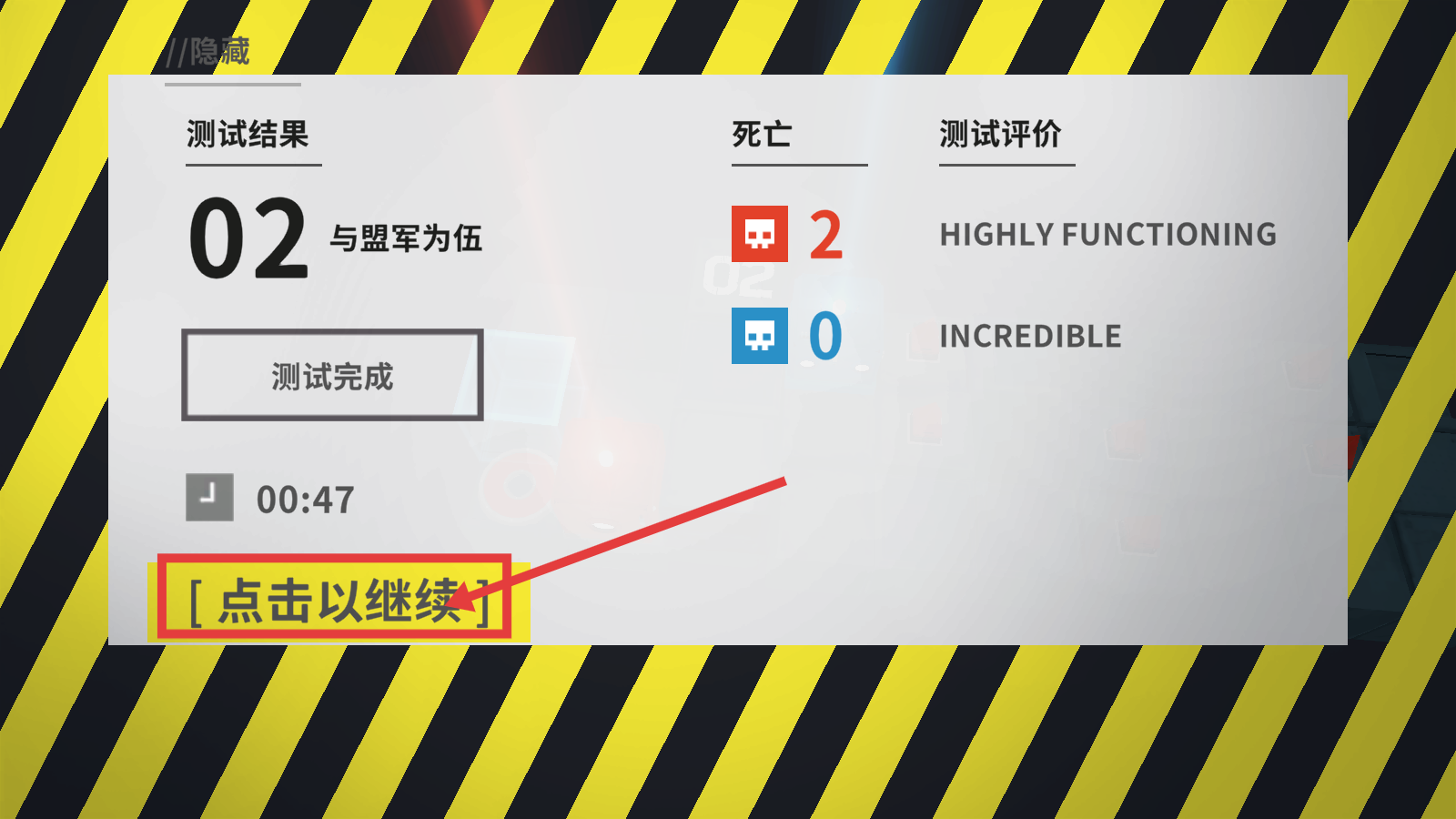 4、关卡完成后,点击【点击以继续】,查看测试结果,继续挑战下一关。