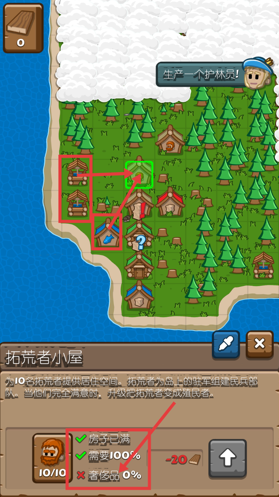 3、拓荒者小屋满员后,需满足【奢侈品-0%】需求,完善设施以提升拓荒者满意度,为升级成殖民者做准备。