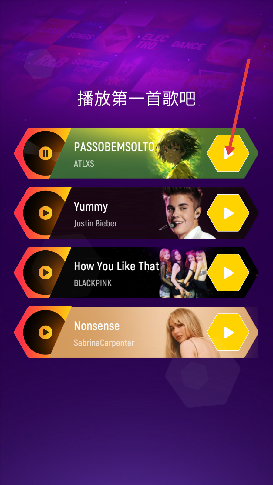 1、选择【PASSOBEMSOLTO】歌曲,点击播放按钮开始游戏,开启音乐节奏挑战之旅。