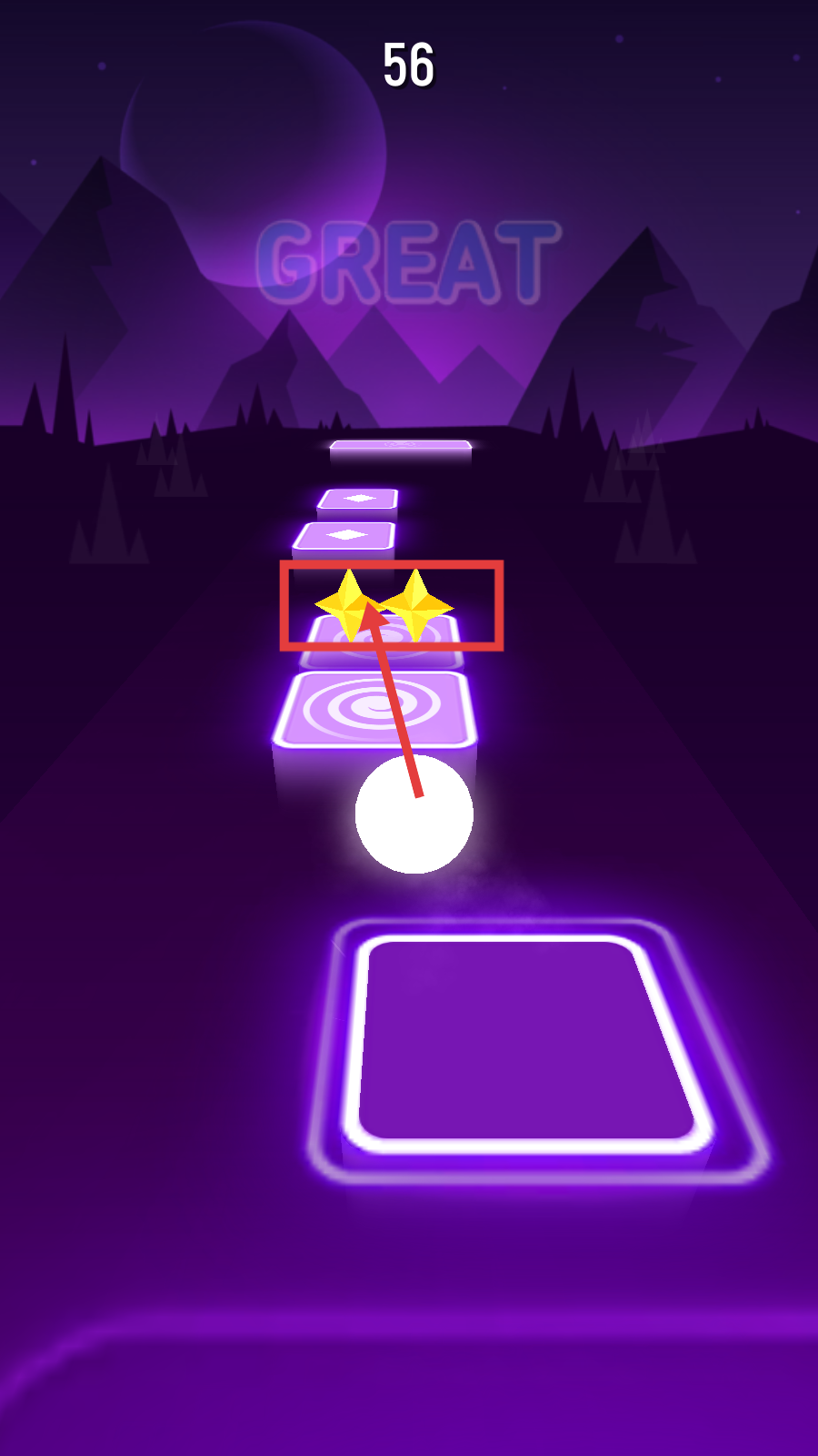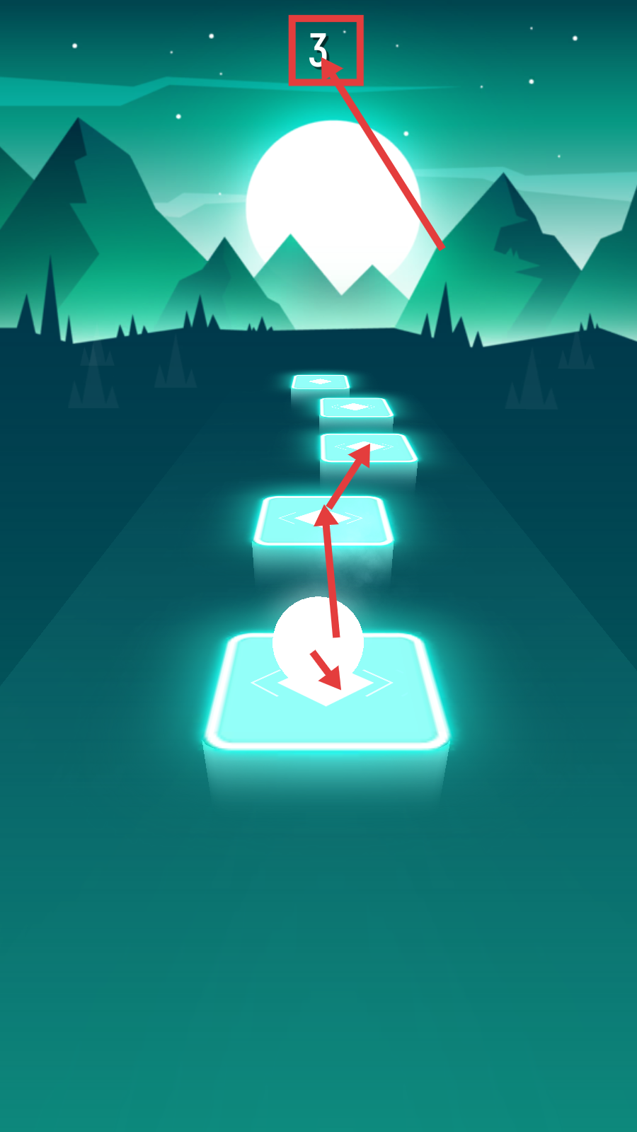 2、游戏开始关注倒计时,跟着节奏操控小球踩中发光方块,把握时机确保每一步精准。