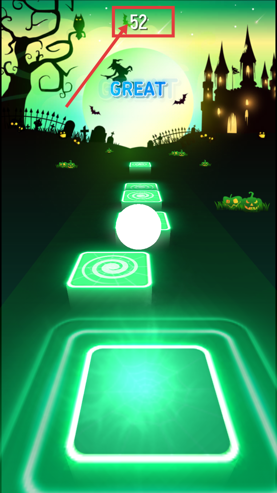 2、操控小球精准踩中发光方块,获得【GREAT】评价,积累分数至【52】,逐步提升游戏表现。