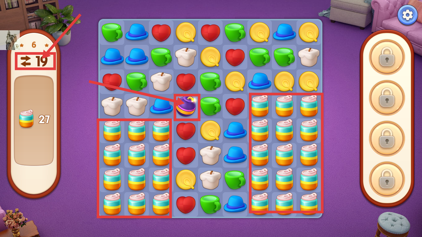 2、消除时关注左侧【步数-19】,利用道具大范围消除彩色罐子,推进关卡进度。