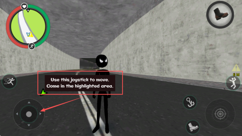 2、如何移动角色:使用屏幕左下角的虚拟摇杆,将角色移动到高亮区域。