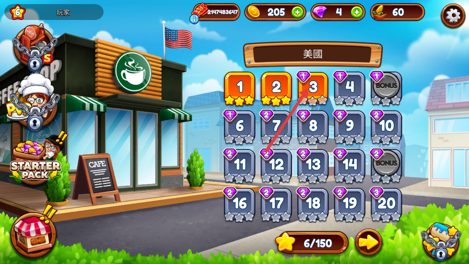 1、选择【美国】区域第3关,消耗【1】紫钻进入关卡,挑战新关卡以解锁更多咖啡店经营内容。