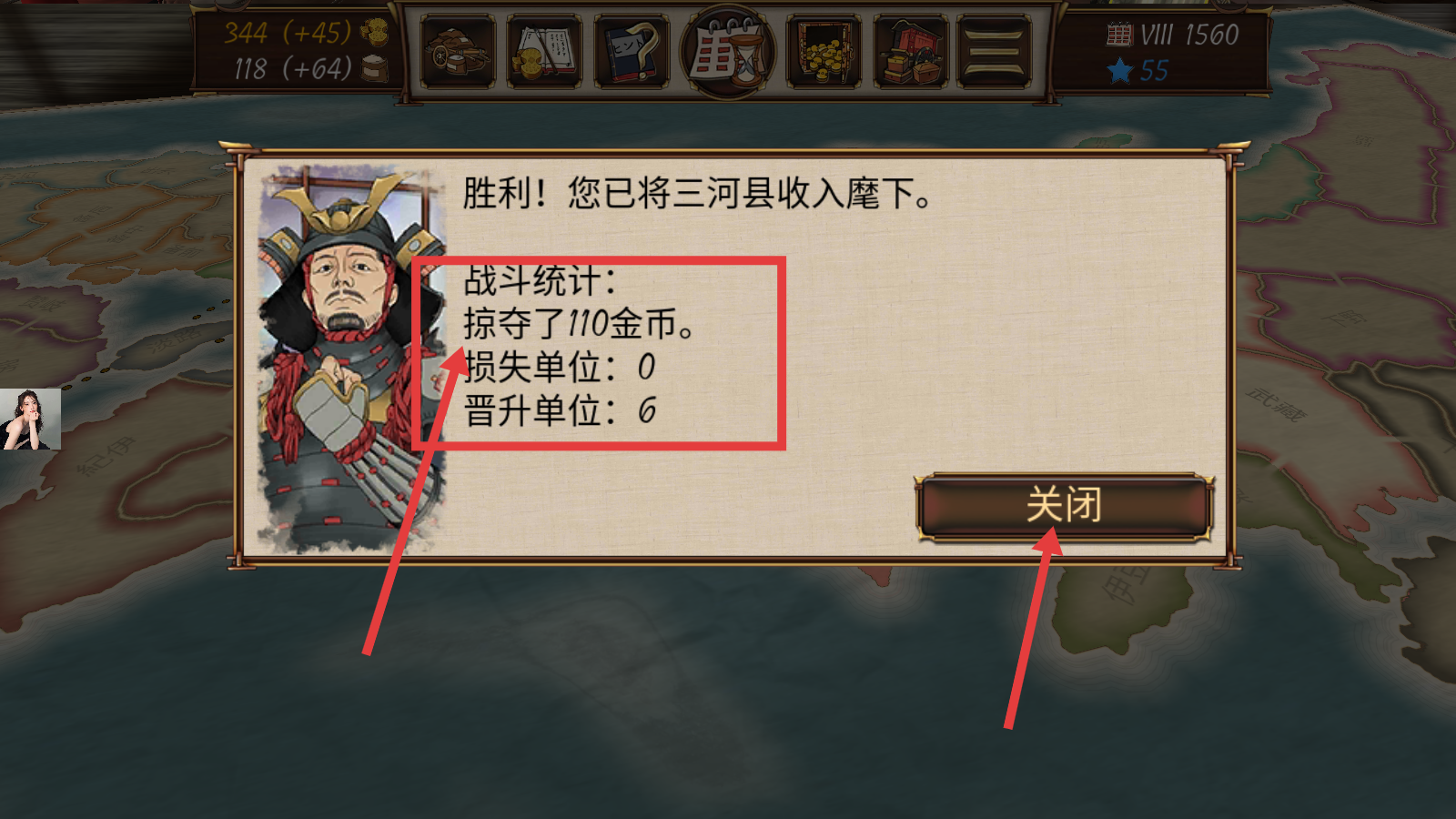 4、胜利后,查看战斗统计(掠夺110金币、损失单位0、晋升单位6),点击“关闭”,完成三河县征服并推进游戏进程。