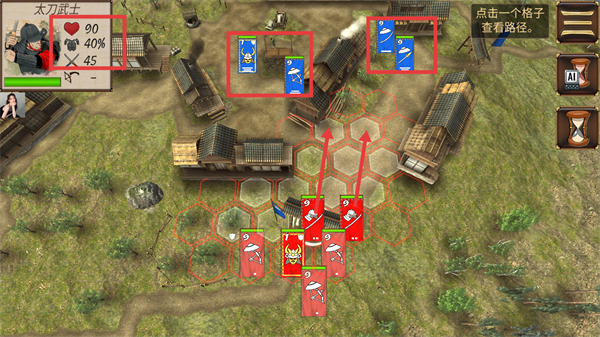 2、战斗中,关注己方单位属性(如太刀武士生命值90等),观察敌方蓝色旗帜部队位置,规划红色六边形移动路径,部署部队推进。