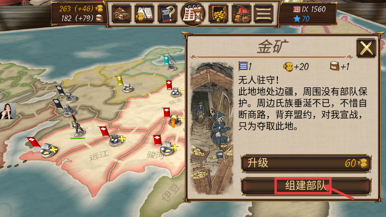 2、针对金矿等资源点(无人驻守,可获金币+20、粮食+1),点击“组建部队”,建立军事力量以保护和开发资源,同时防范周边氏族的争夺。
