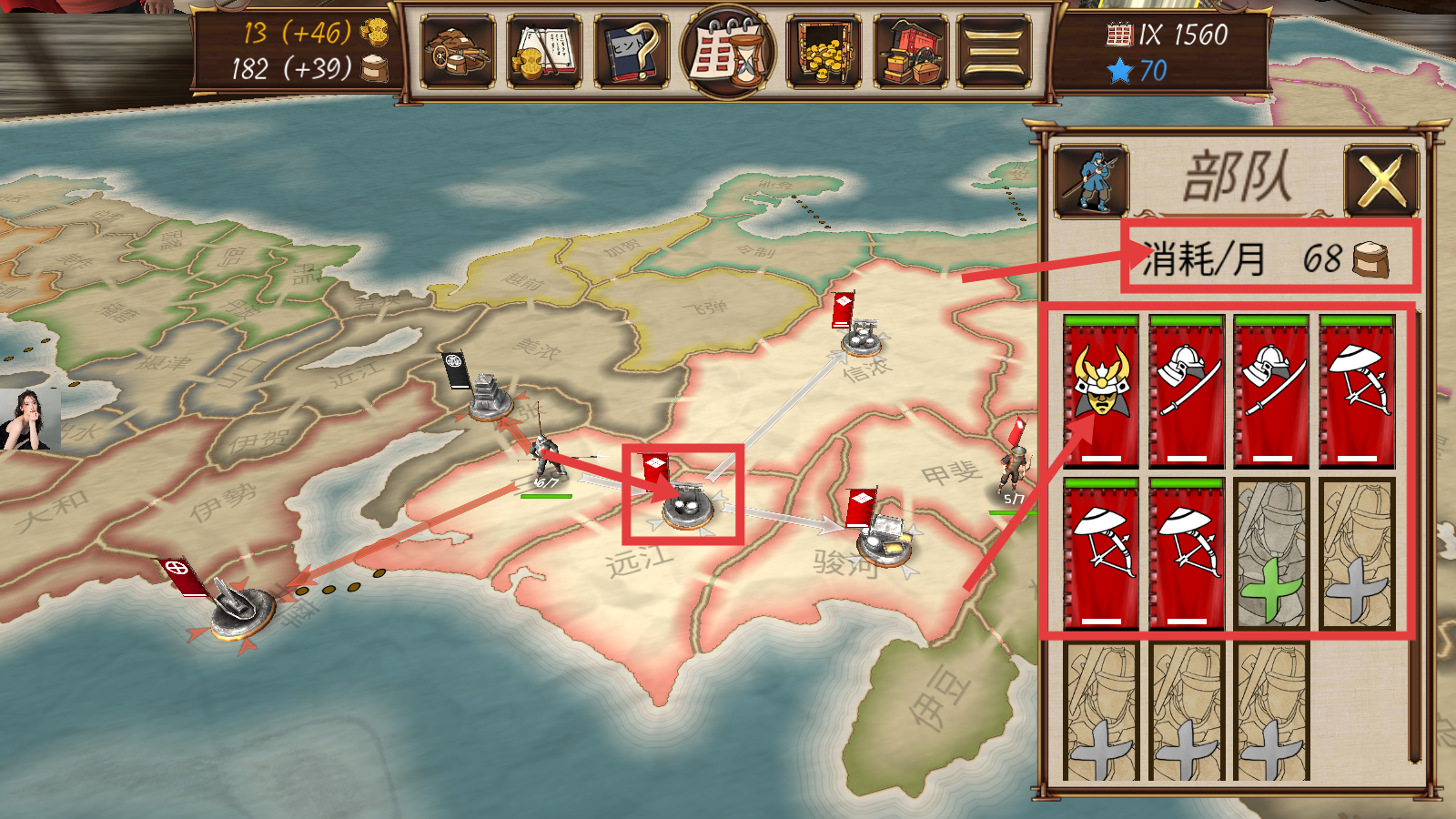 4、组建部队后,关注每月消耗(如68粮食/月),合理部署部队至据点,平衡资源与军事力量,持续推进领地扩张与资源掌控。