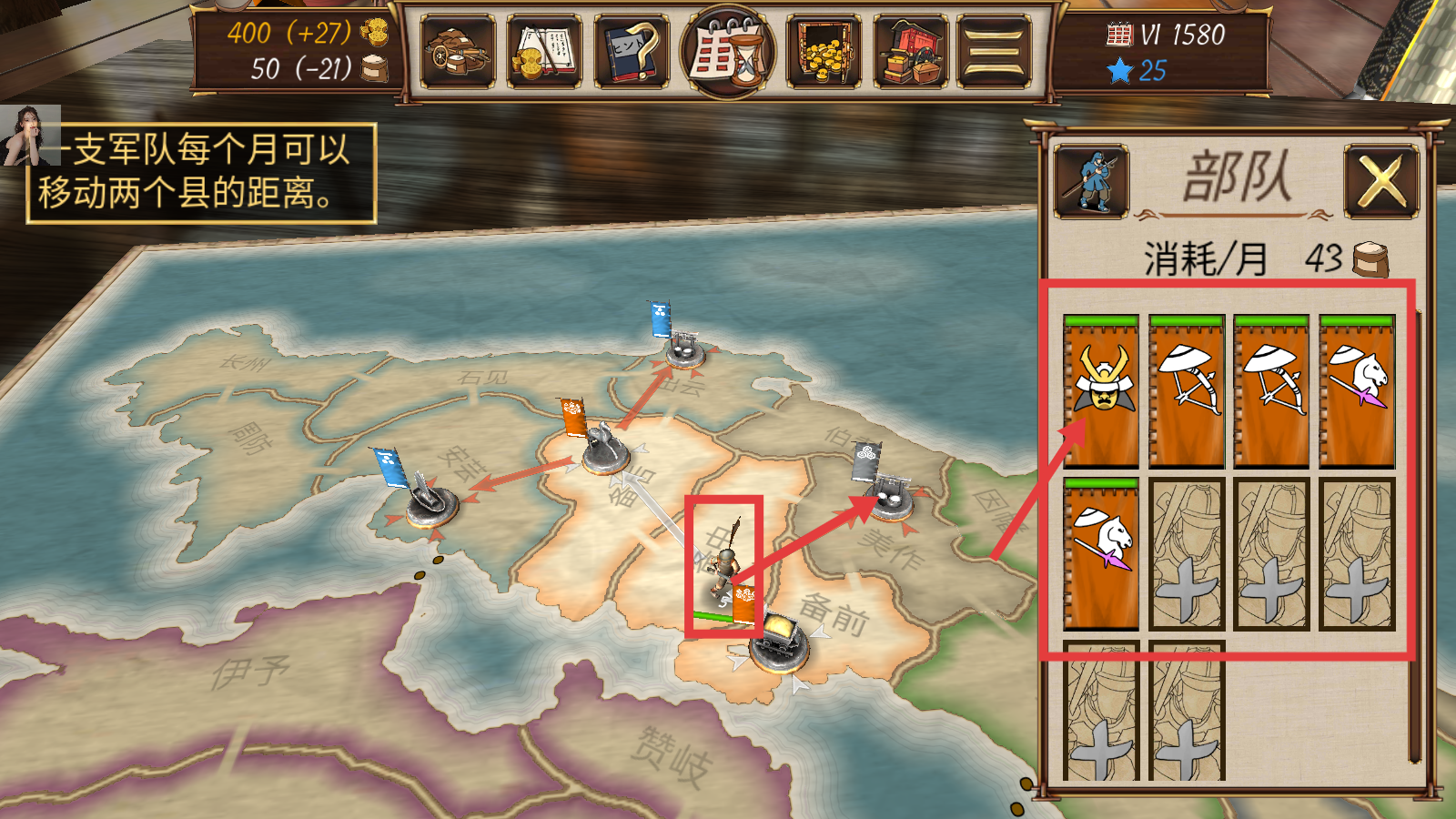 3、部队每月可移动两个县,需合理编排【部队】组成,规划移动路线,高效扩张领地。