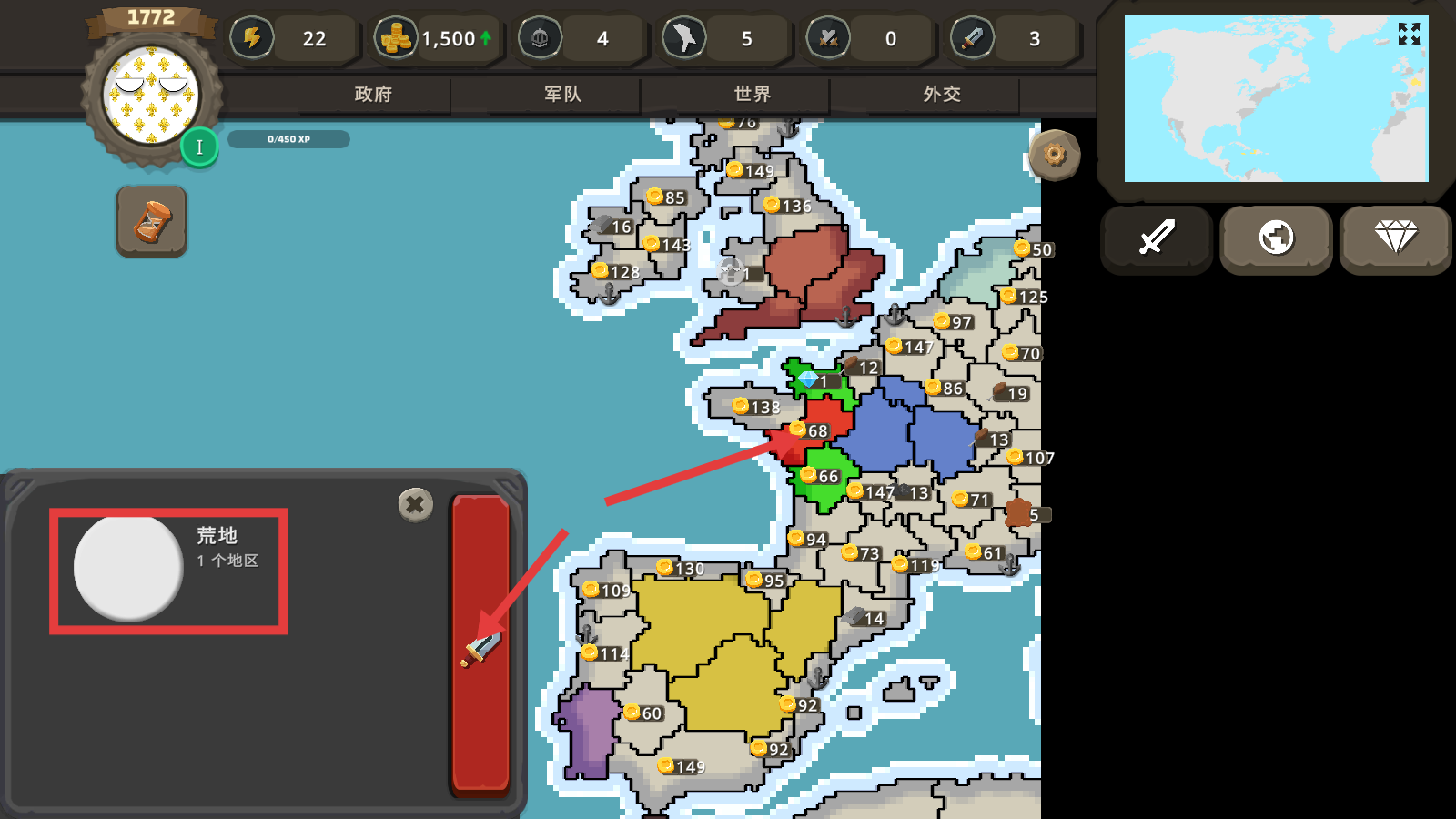 2、在地图界面,关注【金币-1,500】,点击右侧sword按钮,选择资源地区进行开发。