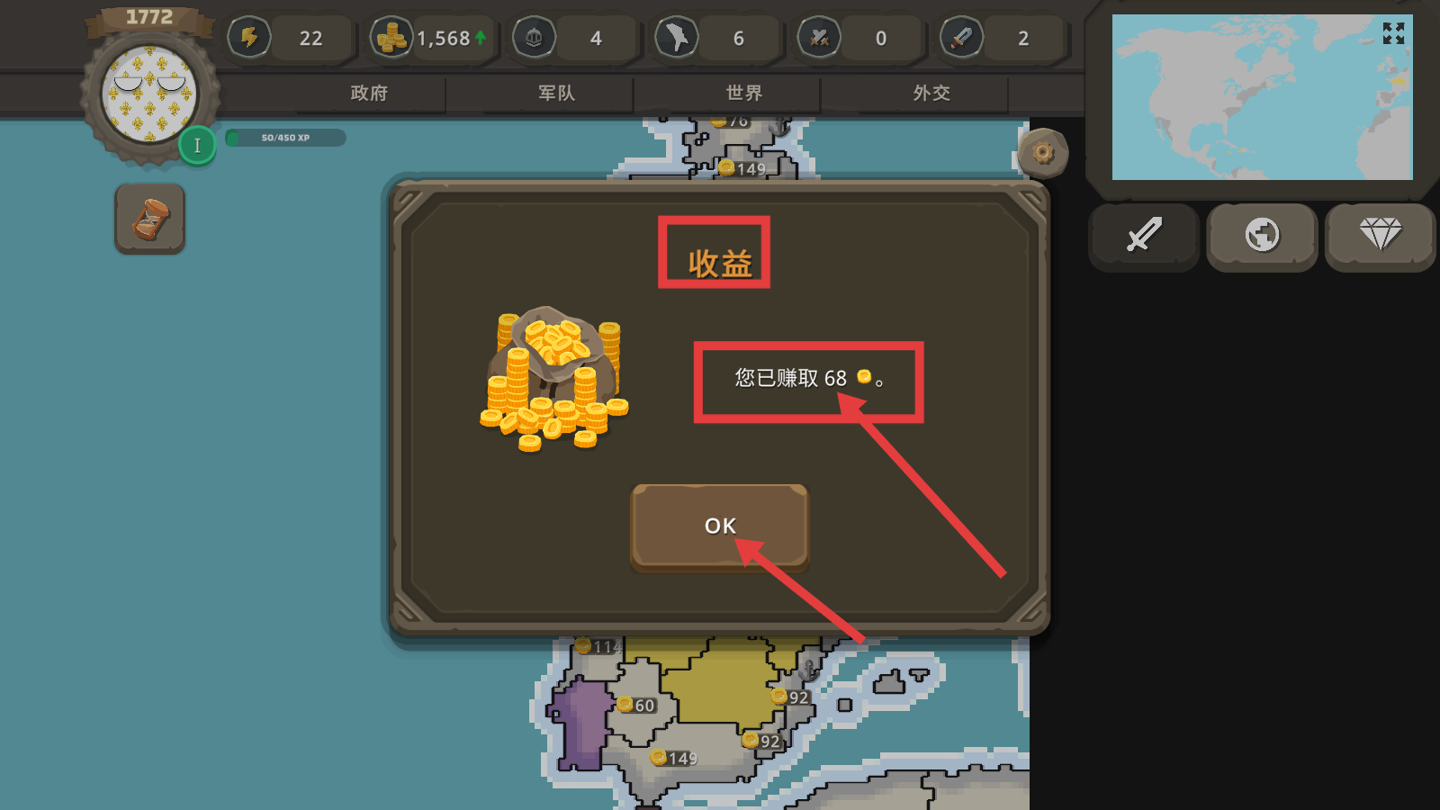 4、开发地区后,查看【收益-您已赚取68金币】,点击【OK】领取资源,积累金币推进游戏。