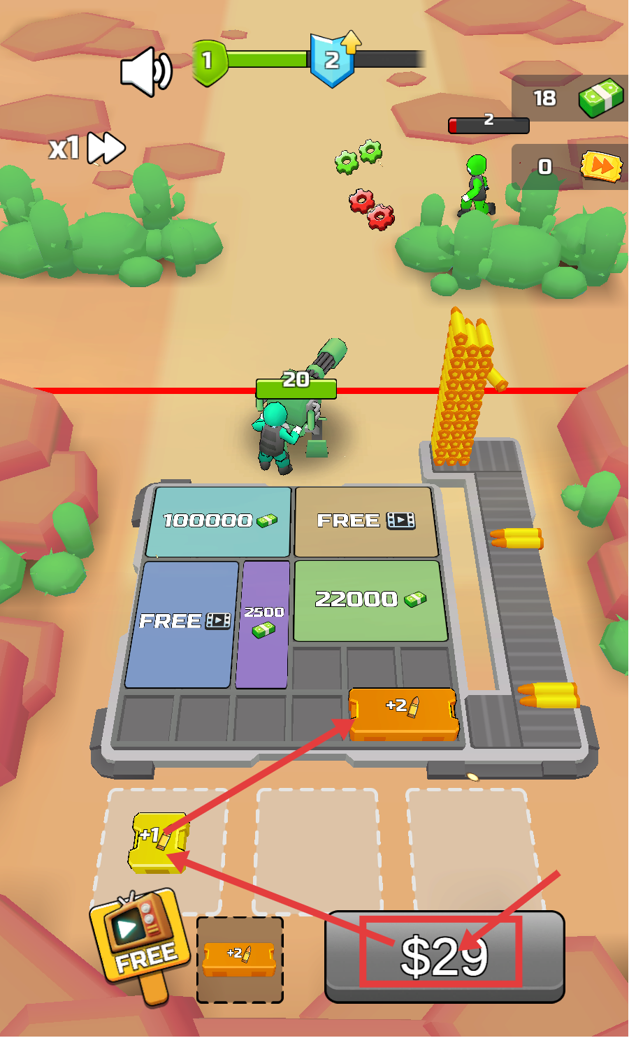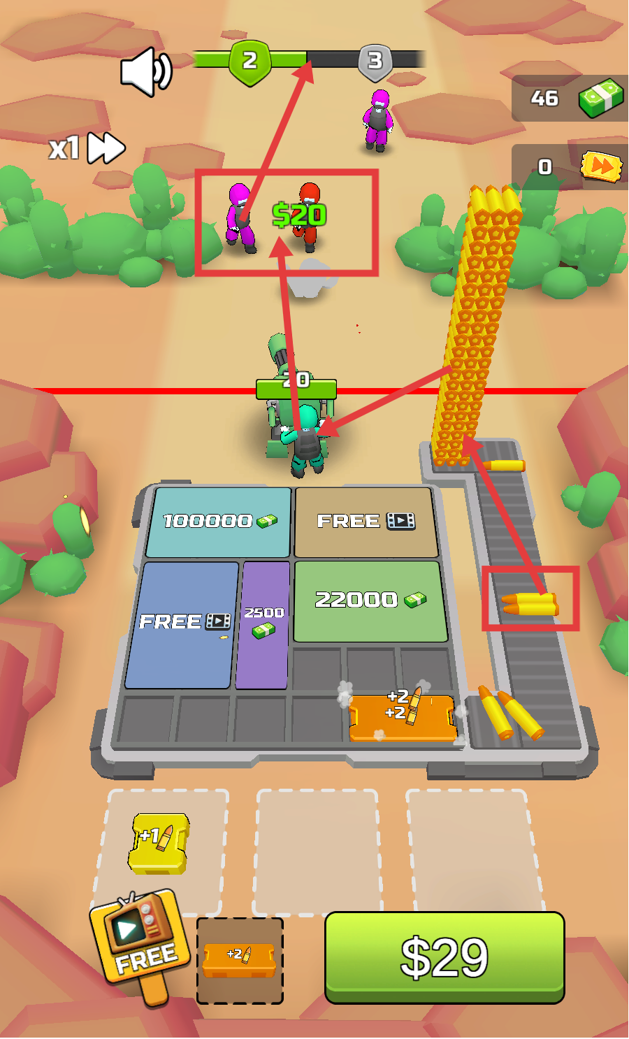 1、在游戏界面,利用【$29】资源,点击+1、+2子弹的元素,积累子弹资源,推进战斗进程。