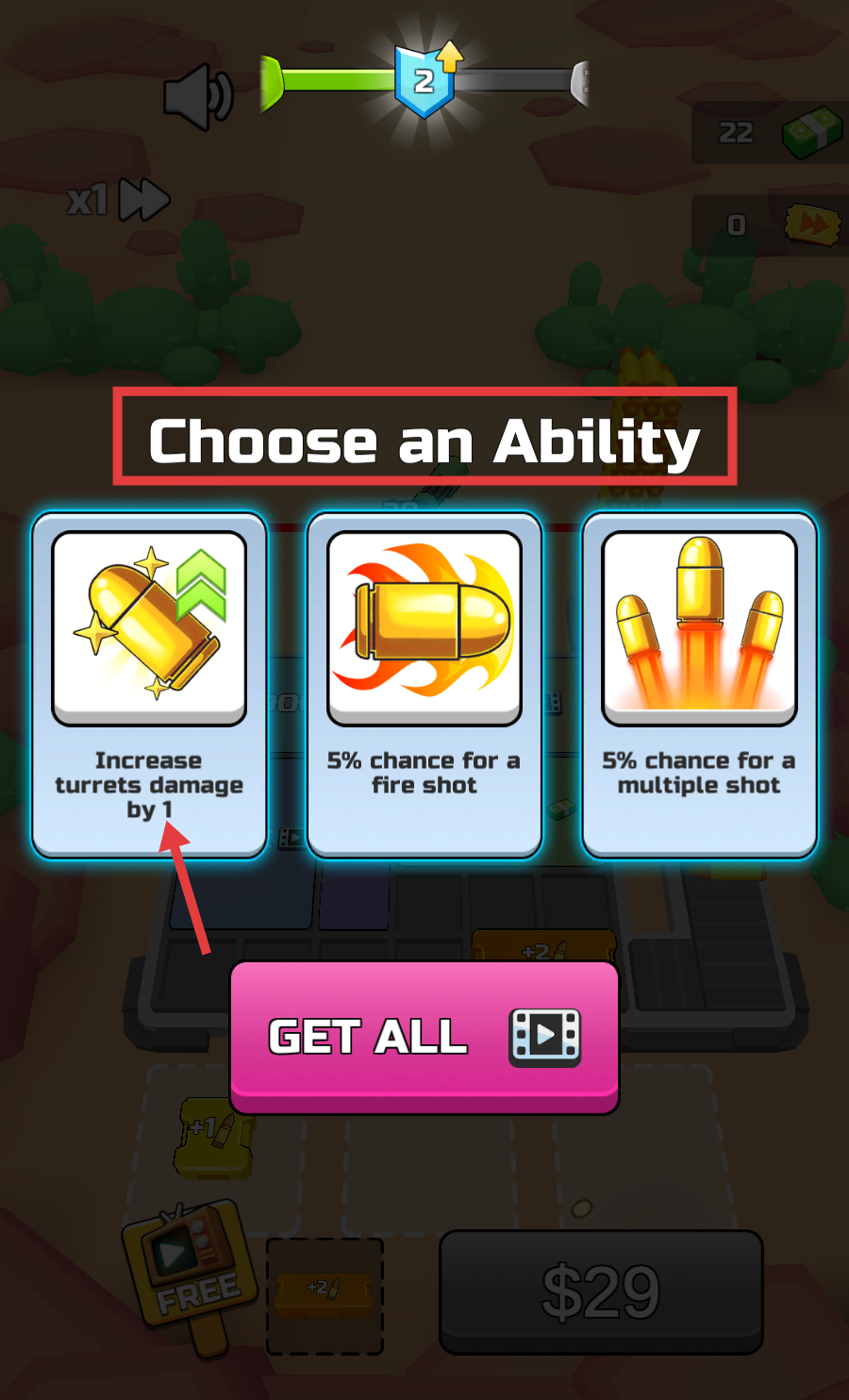 2、在【Choose-an-Ability】界面,选择【Increase-turrets-damage-by-1】能力,提升炮塔伤害,增强战斗能力。