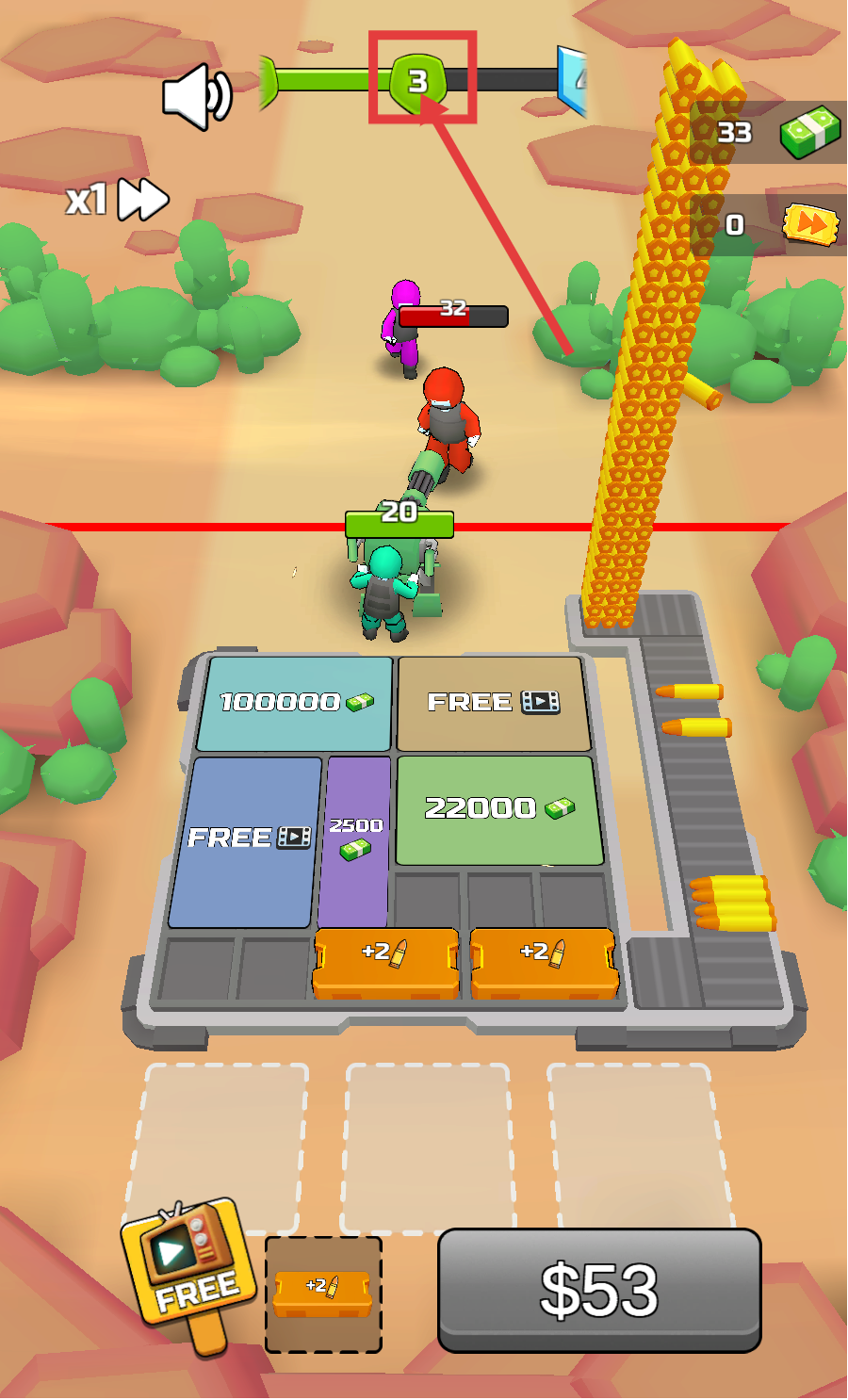 3、战斗中击败敌人获取【$20】资源,积累子弹堆叠,推动等级从2提升到3,扩大势力。