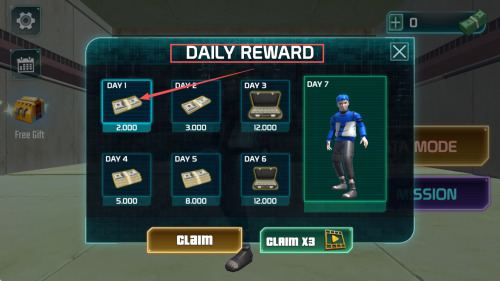 1、如何领取每日奖励:在主界面点击“CLAIM”或“CLAIM×3”,领取第一日金币奖励。