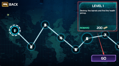 3、如何开始第一关:在任务列表选择“LEVEL1”,点击“GO”进入战斗。