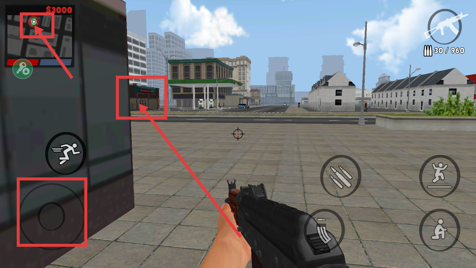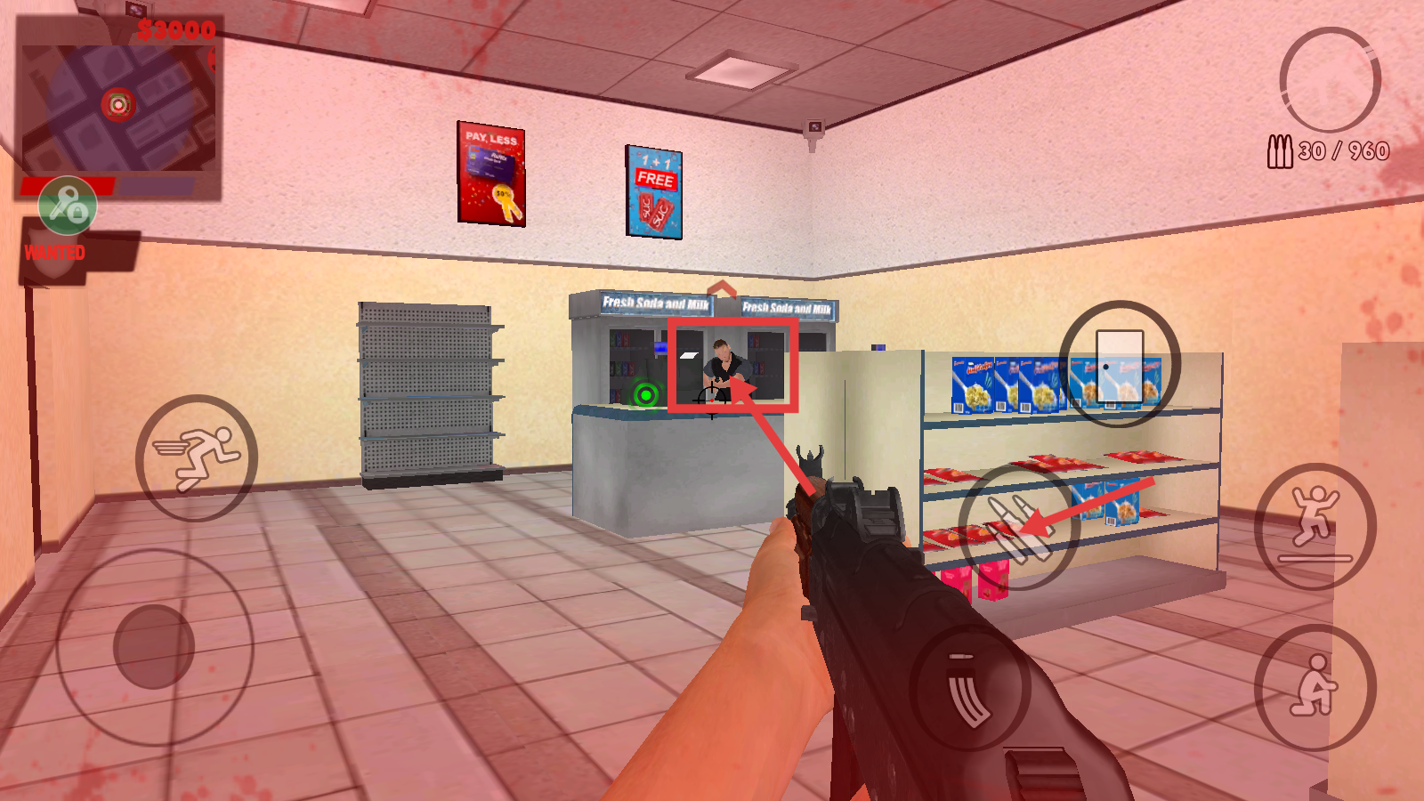 3、进入商店后,瞄准柜台目标人物,点击武器按钮发起攻击,快速推进剧情,完成当前场景任务。