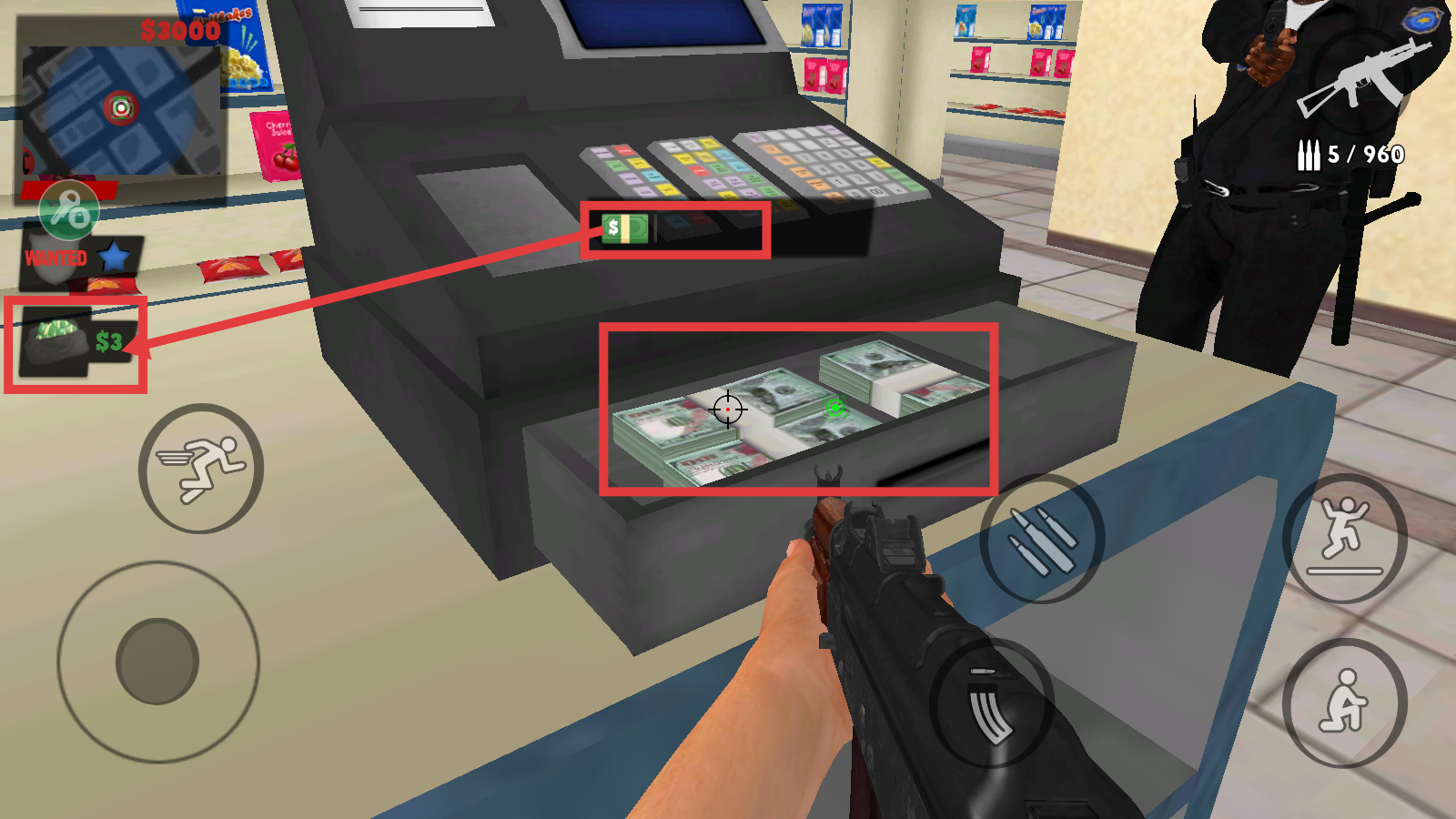 4、攻击收银台后,收集现金,留意左侧【$3】奖励提示,积累游戏资源,为后续行动提供支持。