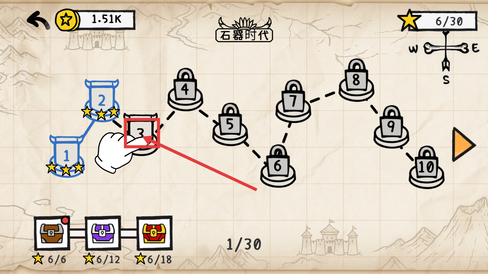 1、在关卡地图界面,点击【3】进入对应关卡,逐步推进解锁后续关卡,积累星星和资源。