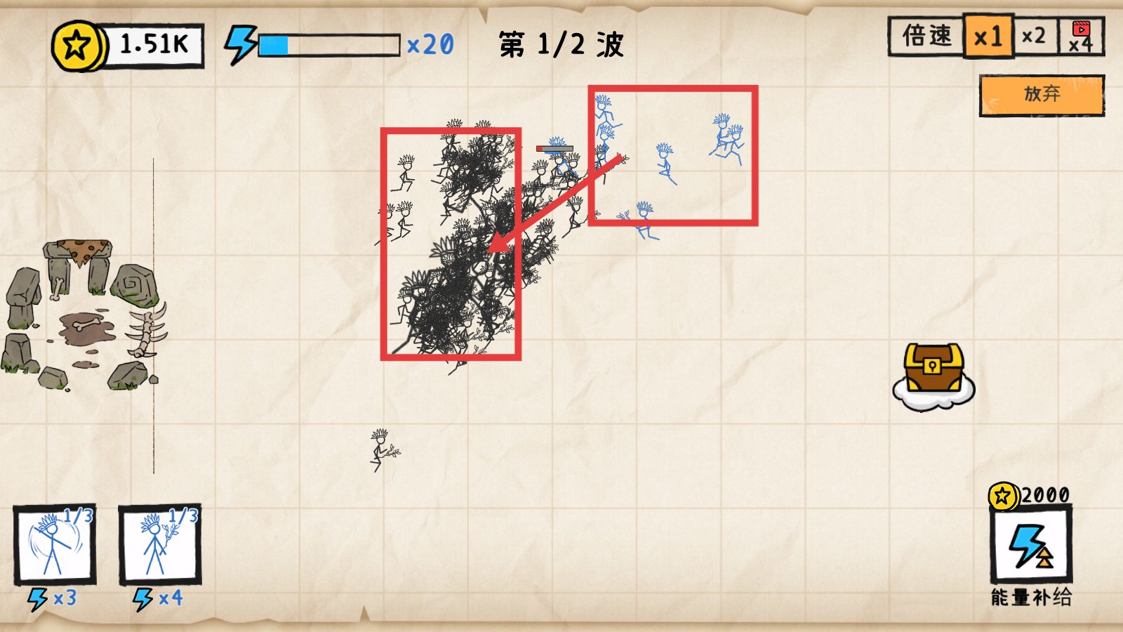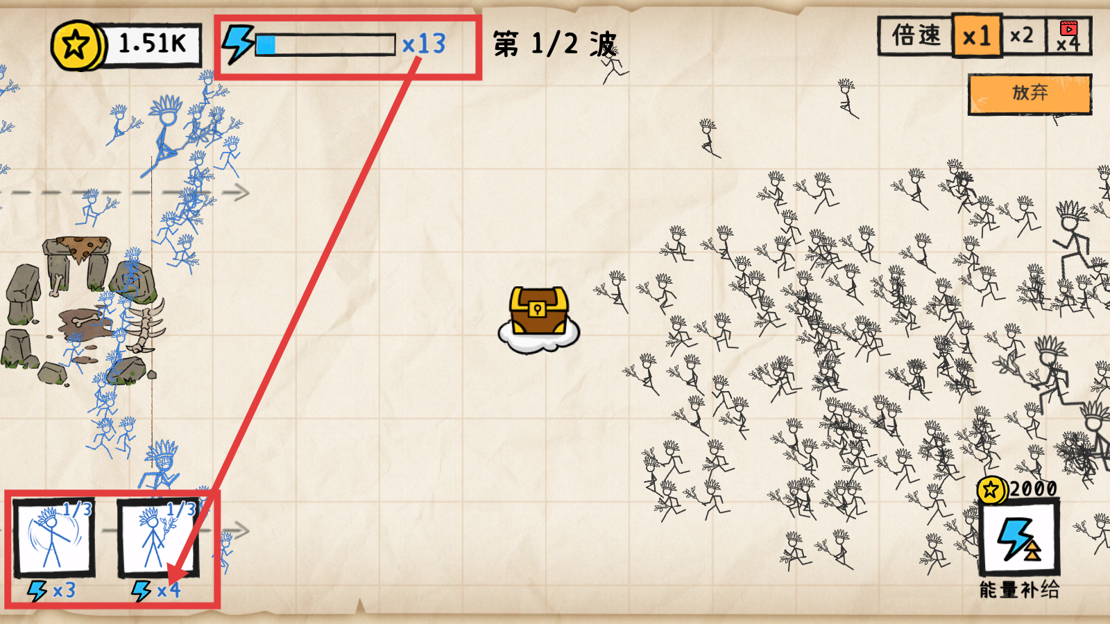 2、战斗时留意【能量】条,合理使用左下角兵种技能,消耗能量释放兵种抵御敌人,保障防线。