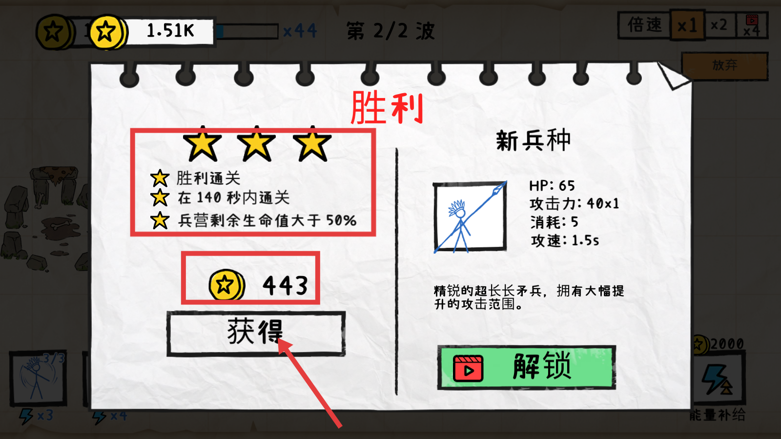 4、胜利通关后,获得三星评价和【443】金币,点击【获得】领取奖励,还可解锁新兵种提升战力。