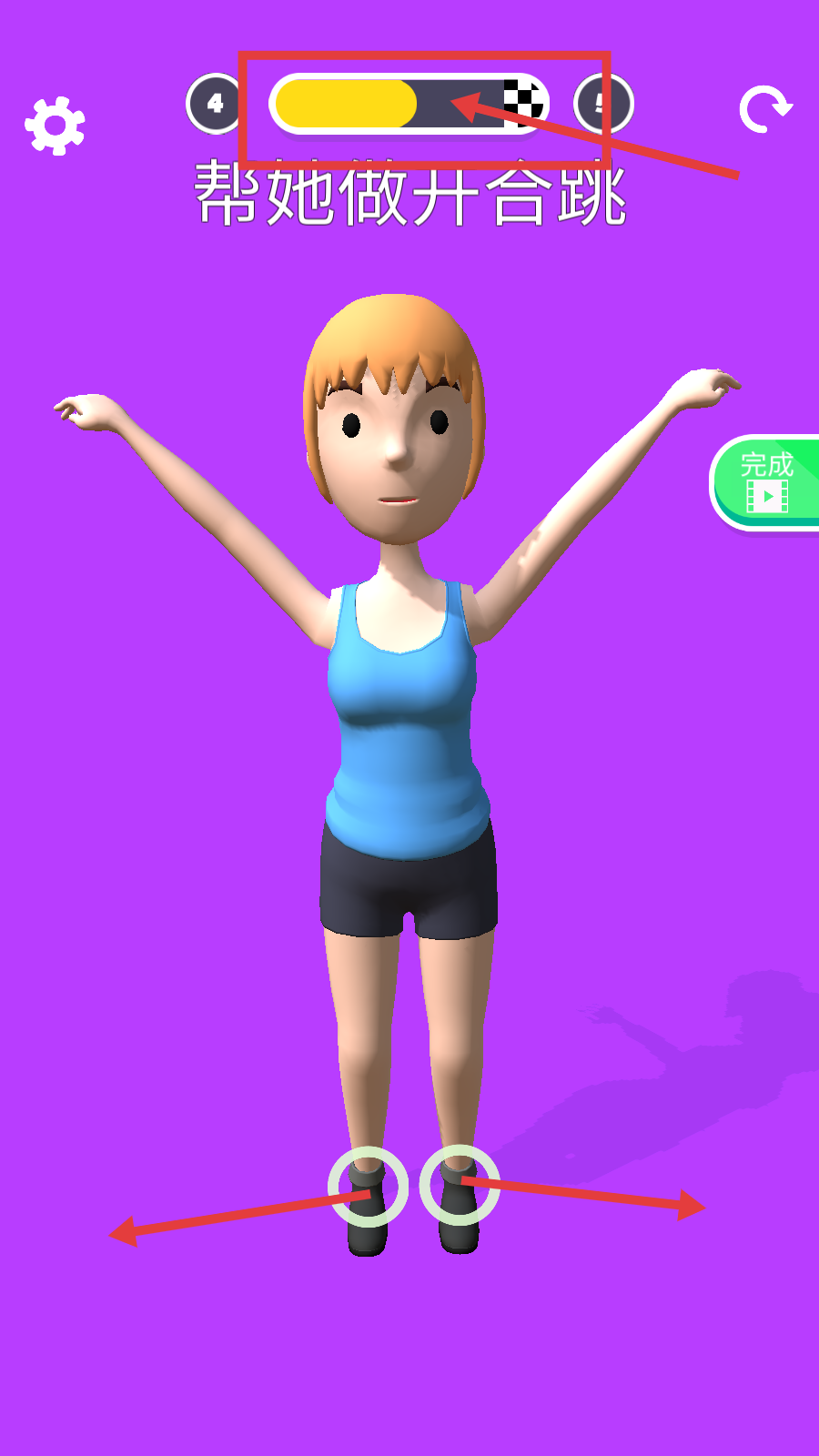 3、关注上方进度条,完成角色手臂张开和脚部开合的动作,填充进度条以完成开合跳任务。